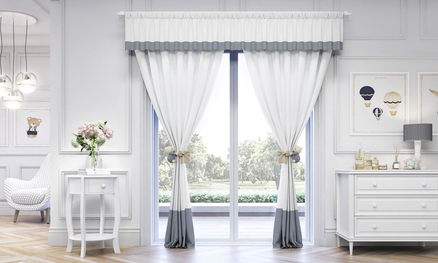 Além do design apaixonante, ela também se destaca por sua funcionalidade, já que permite que a mamãe e seu bebê tenha privacidade durante a amamentação ou troca de fraldas. Esse mimo de cortina combina muito bem com todos os produtos da coleção Luxo Branco e Azul Marinho e vai conquistar a todos!