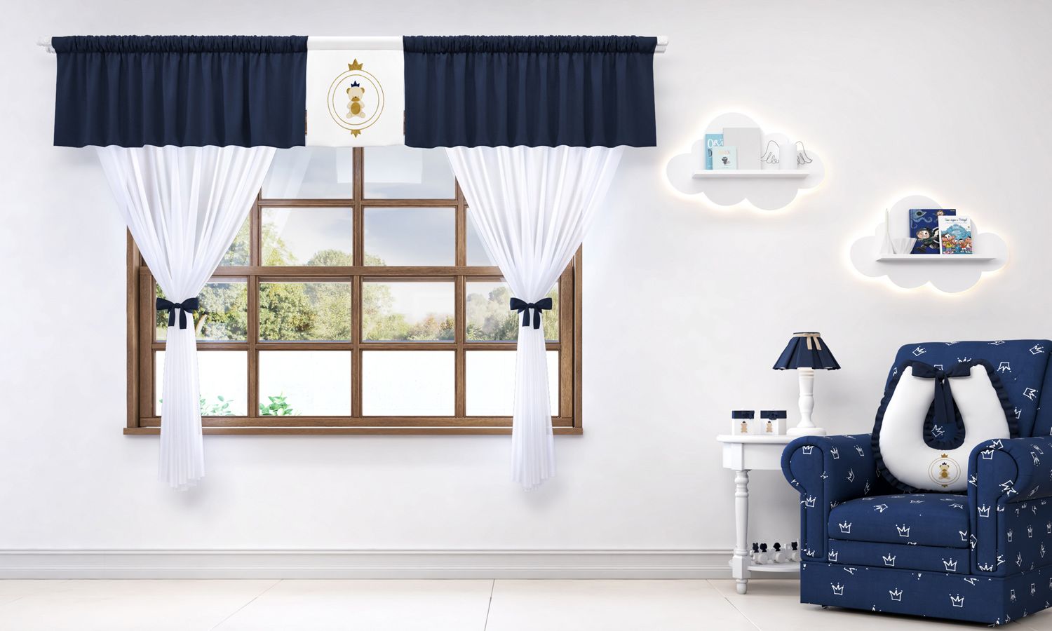 Para enobrecer a decoração do quarto de bebê, a Cortina Urso Teddy Realeza ganhou detalhes sofisticados e marcantes, dignos de um príncipe! Exclusivo, o modelo de 1,50 metros de altura é super versátil, já que diminui a entrada de luz excessiva, protege os sensíveis olhinhos do recém-nascido e mantém a privacidade da família na hora da troca e mamada. Ornando perfeitamente com o estilo proposto para o ambiente, ele ganha laços como amarris e um bandô azul-marinho, bordado com o ursinho Teddy e suas coroas — bem clássico!