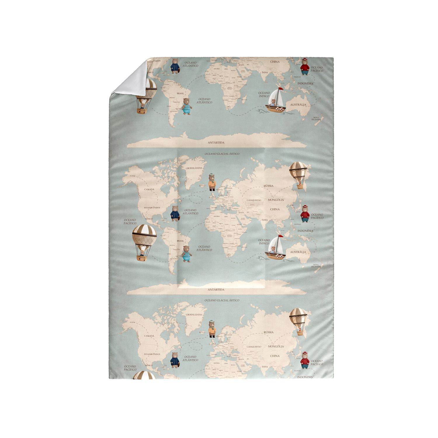 O Edredom de Berço Teddy pelo Mundo é uma peça lúdica, com visual vintage e super criativo para completar o enxoval dos sonhos, além de aquecer seu bebê na medida certa. Exclusividade da Grão de Gente, essa linda estampa de mapa mundi em alta definição vai compor a decoração do quarto de bebê com aconchego e originalidade.
