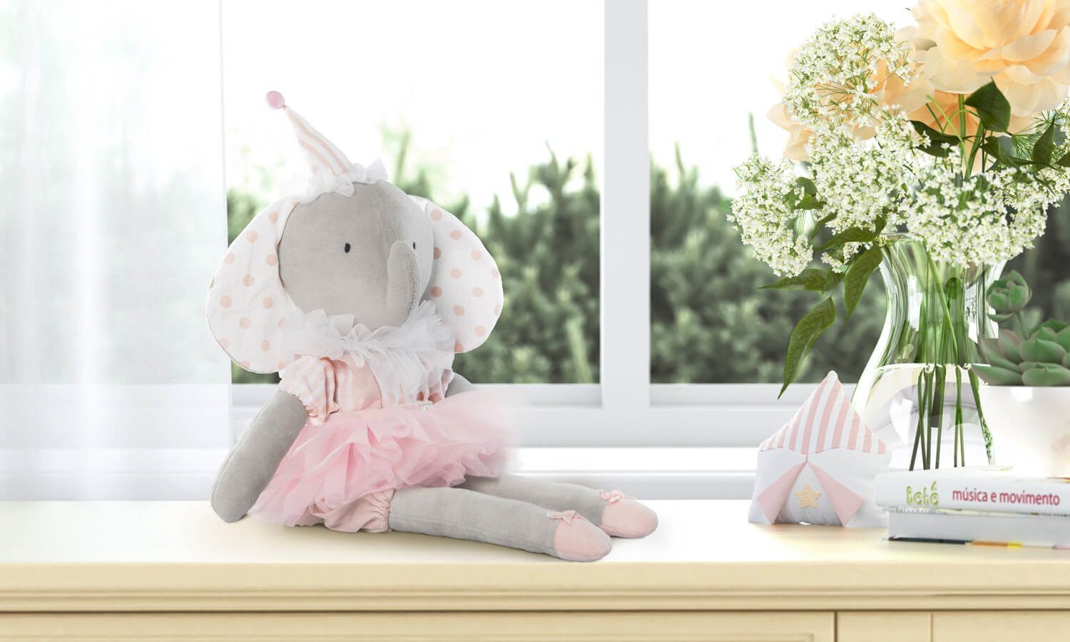 Diversão garantida! Além de compor um ambiente lúdico com criatividade e aconchego, a Elefante Mimo Bailarina do Circo 48cm aparece para completar a decoração do quarto de bebê com uma proposta super meiga! Essa simpática elefantinha veste uma saia de tule cor-de-rosa, usa um gracioso chapéu com listrinhas, tem orelhas em poá e calça sapatilhas com um delicado lacinho. Confeccionada com a maciez do tecido plush e enchimento macio, o rostinho bordado à mão finaliza com elegância esse mimo repleto de detalhes. Ótima companhia para brincar e tornar o décor mais afetivo, além de proporcionar momentos especiais para o seu amor.