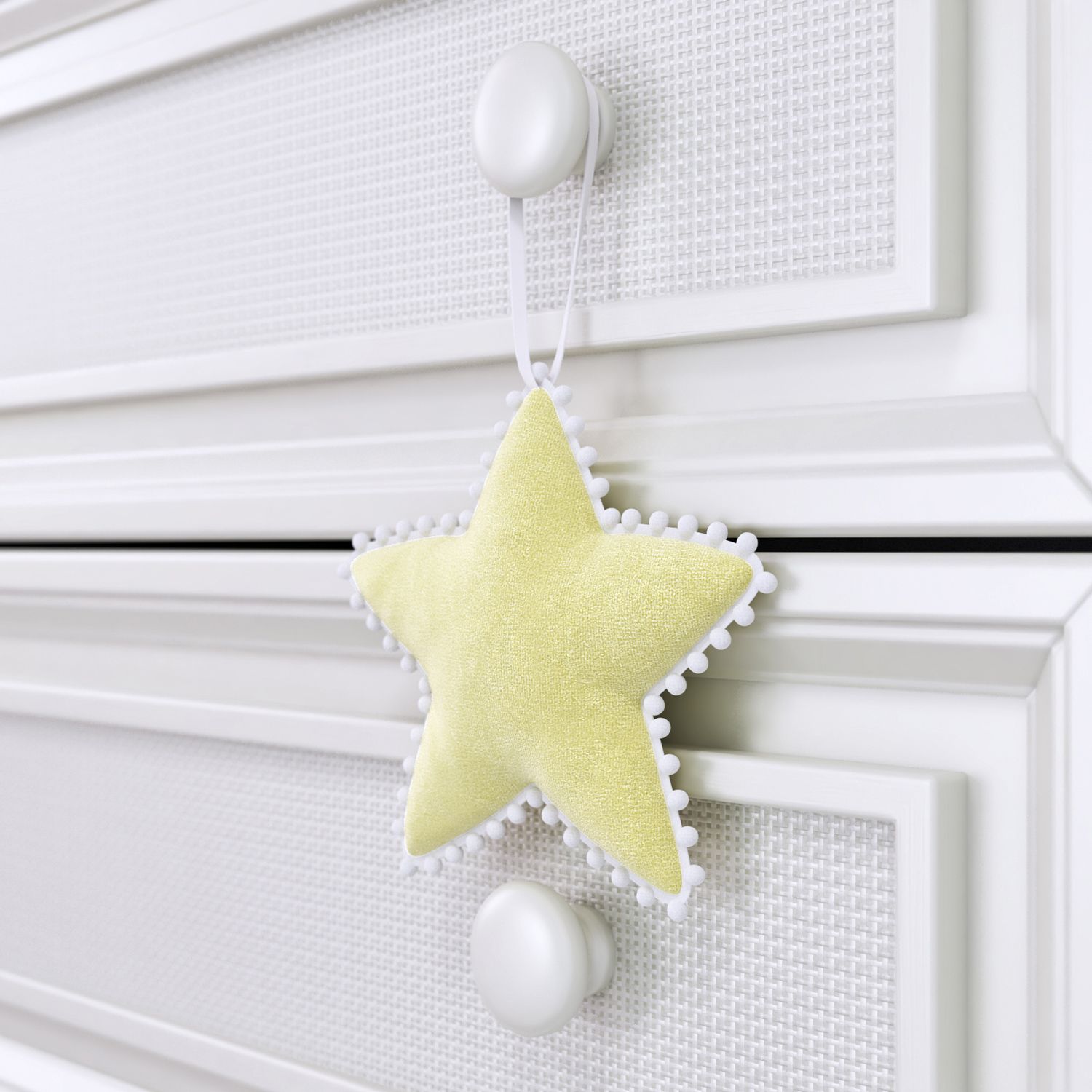 Enfeite para Puxador da Coleção Fada! Uma macia almofadinha em formato de estrela com passamanaria pompom, perfeito para tornar esse universo mágico e encantado ainda mais delicado. Você pode usá-lo na maçaneta da porta, nos puxadores da cômoda ou do guarda-roupas. Algumas mamães também enfeitam o carrinho!