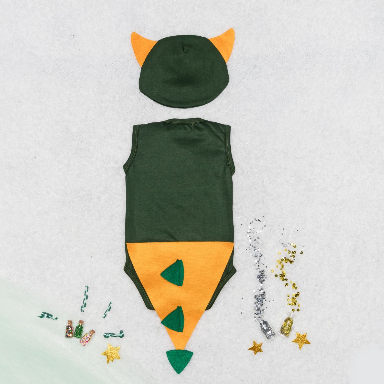 A Fantasia Dinossauro Bebê da Grão de Gente é perfeita para garantir um look super criativo para o seu pequeno aventureiro! Com um body 100% algodão e uma touca verde de algodão com chifres de dinossauro, a fantasia é ideal para comemorações como mesversário, aniversário, carnaval ou festas à fantasia.