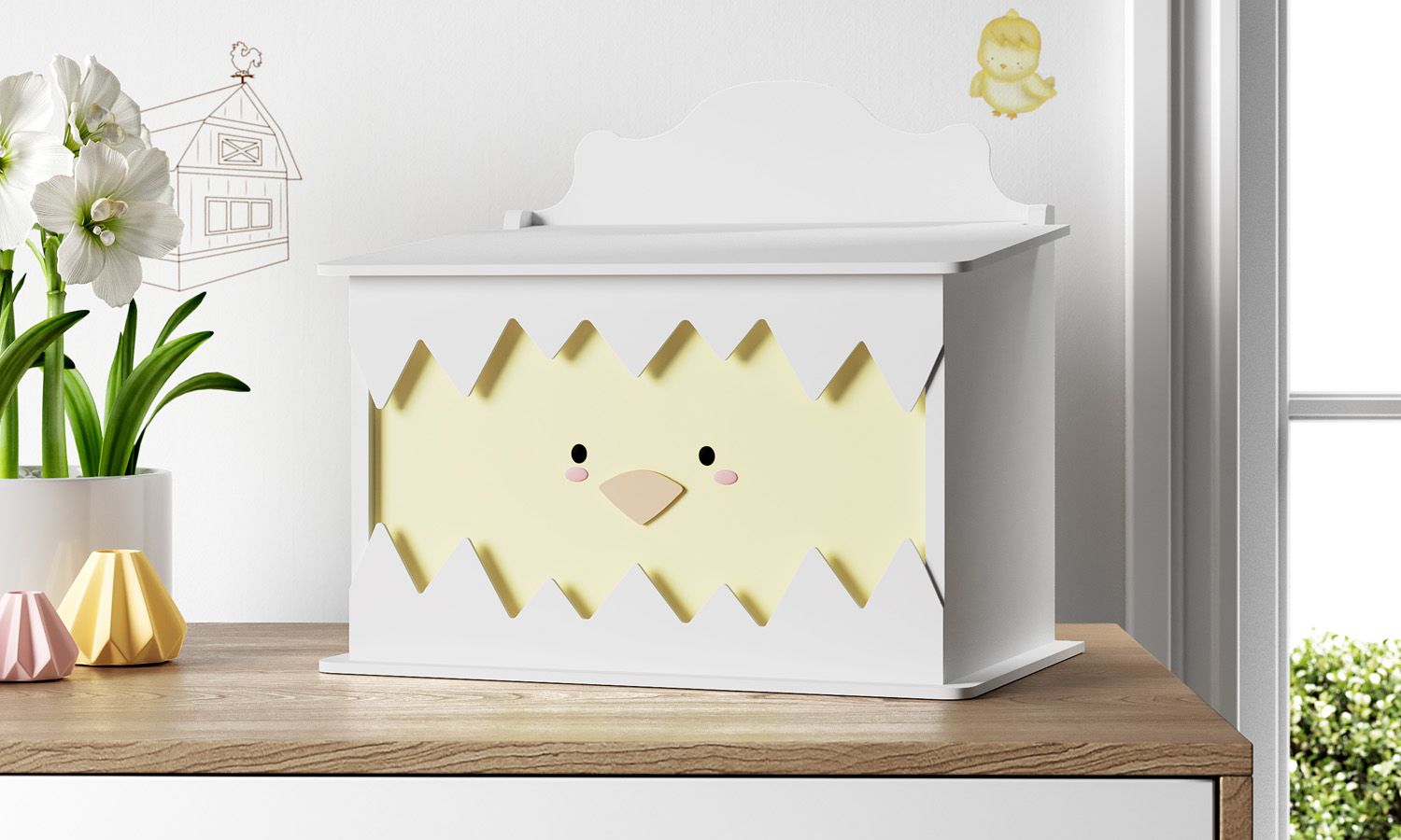 A experiência de guardar e organizar os objetos do bebê fica ainda mais charmosa com a Farmacinha Amiguinho Pintinho. Confeccionada em madeira 100% MDF, seu design esbanja criatividade, com um pintinho entre as cascas do ovo.