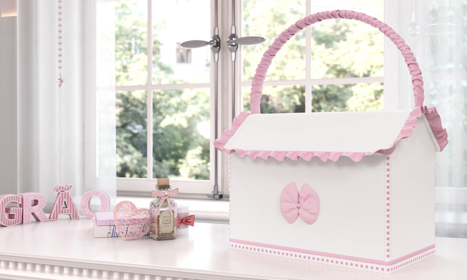 A Farmacinha em forma de casinha do enxoval Pequena Bailarina foi feita para guardar medicamentos e produtos de higiene, mas também fica um charme decorando o quarto de bebê! Esse modelo branco com babadinhos e alça revestida será útil durante vários anos, para armazenar remédios, algodão, pomadas e lencinhos. Muitas mamães aproveitam ainda para pequenos brinquedos ou lembranças escolares.