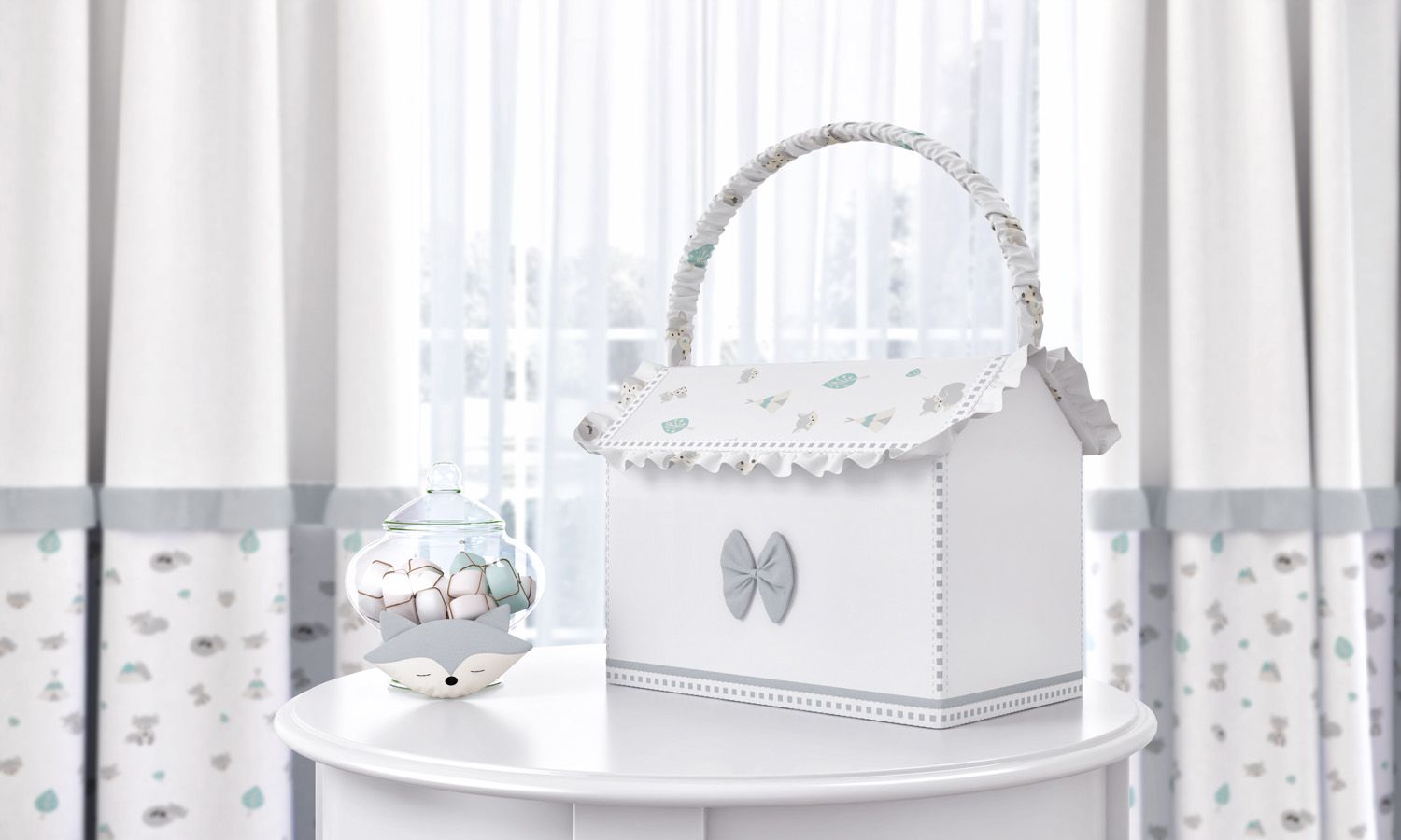 Um design gracioso aliado a funcionalidade que ajuda as mamães e os papais a terem uma rotina mais prática nos cuidados com o seu amor. A Farmacinha Raposinha Cinza se destaca em cada detalhe, já que é extremamente útil para organizar medicamentos, pomadinhas, lencinhos, moringas e outros objetos. Sem contar que o seu formato de casinha é um amor e torna a decoração do quarto de bebê ainda mais especial. Os babados e o passa fita combinado com as cores branco, cinza e verde são encantadores!