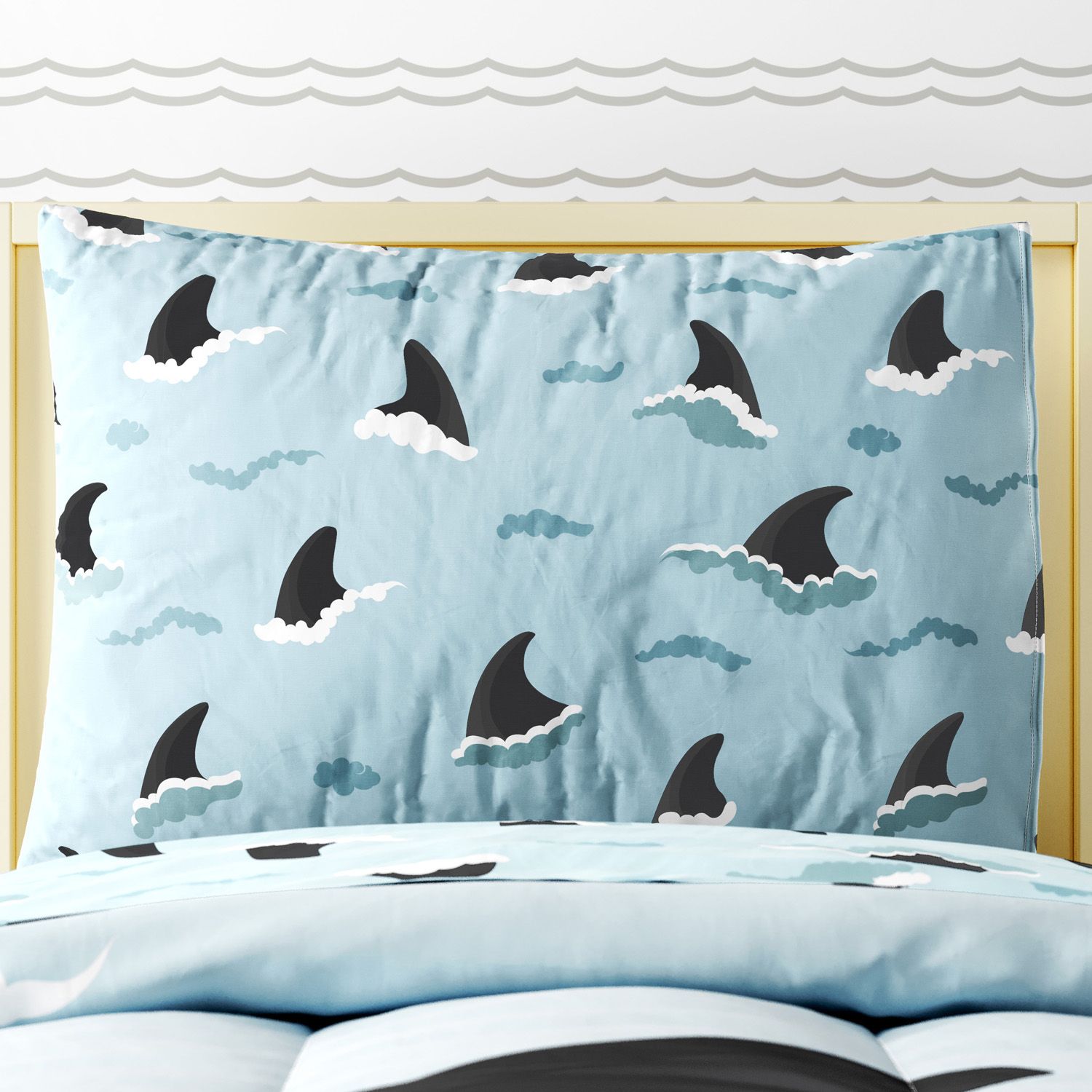 A Fronha de Travesseiro Infantil Fundo do Mar Azul reflete o movimento das ondas do mar e seus mistérios, junto a barbatana de tubarão como protagonista, uma imagem clássica de filmes e desenhos animados que as crianças adoram.