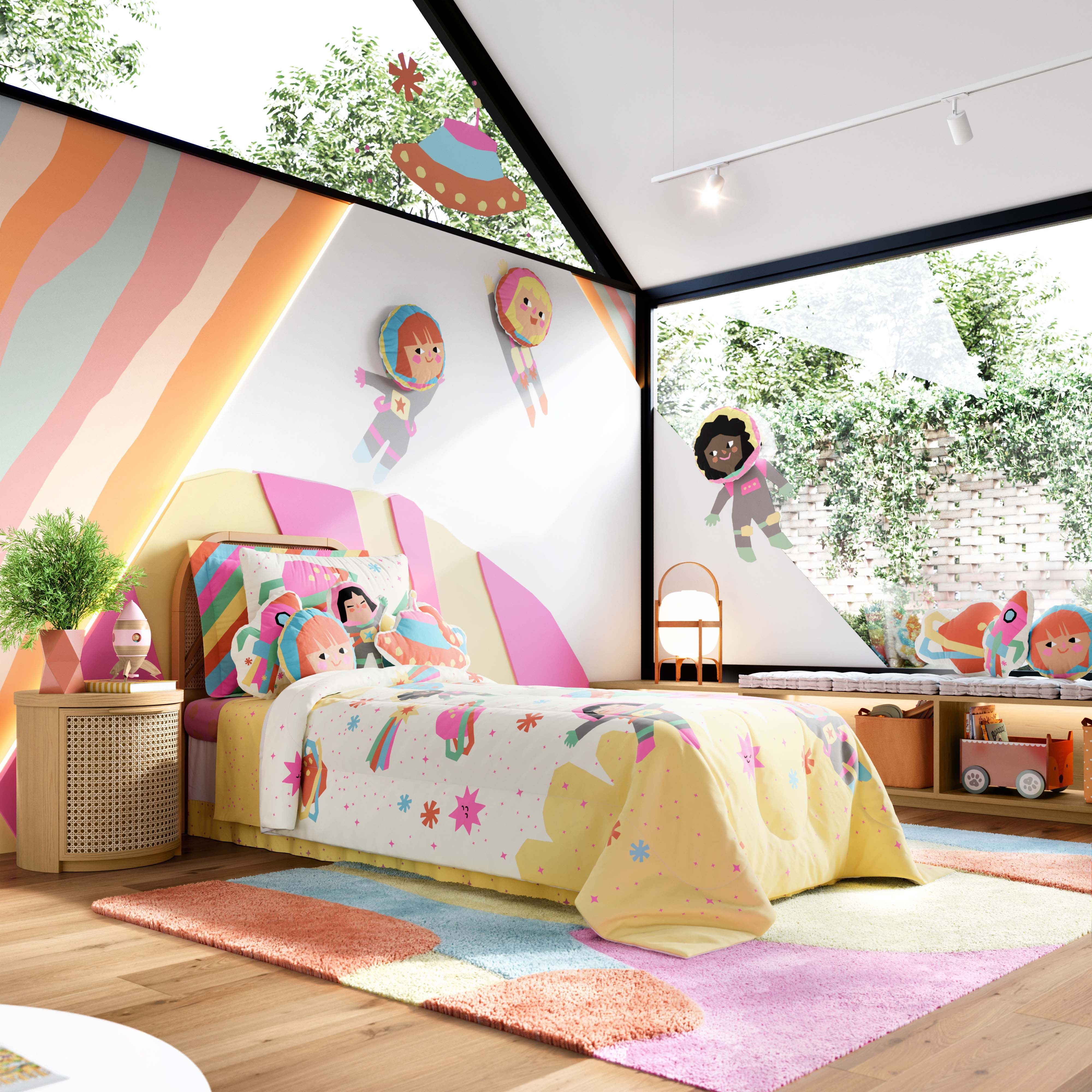 A peça traz estampas inspiradas no espaço sideral. Planetas coloridos e estrelas brilhantes em cores neon, adicionam um toque divertido, moderno e tecnológico ao quartinho.