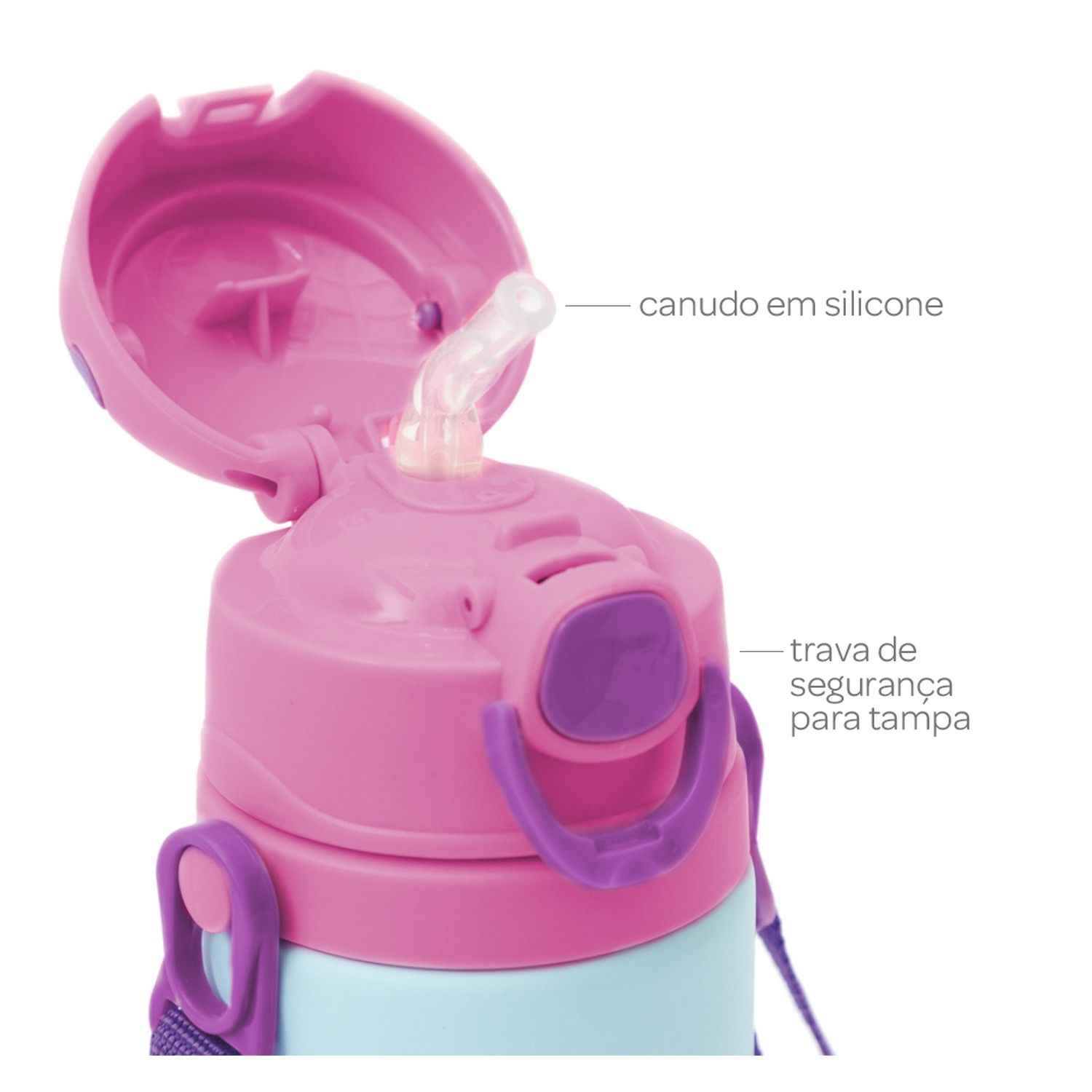 Produzido de alumínio, com cordinha antiqueda, conta também com canudo de silicone que fica protegido quando a tampa é fechada, garantindo praticidade e higiene.