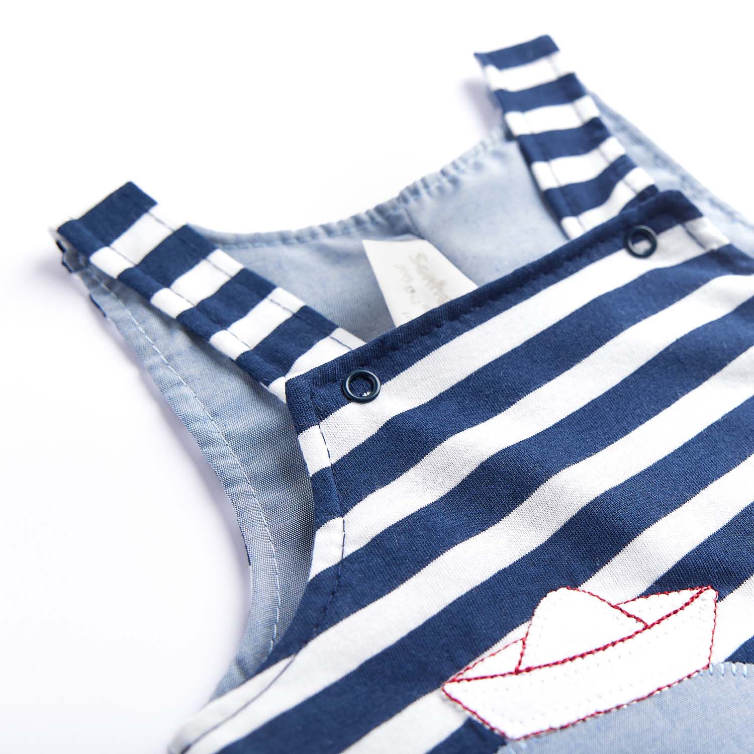 O macacãozinho também possui fechamento com botões de pressão na parte superior e inferior, um bordado de dinossauro divertido e encantador e um aplique de nadadeira interativa, estimulando sensorialmente os pequenos.