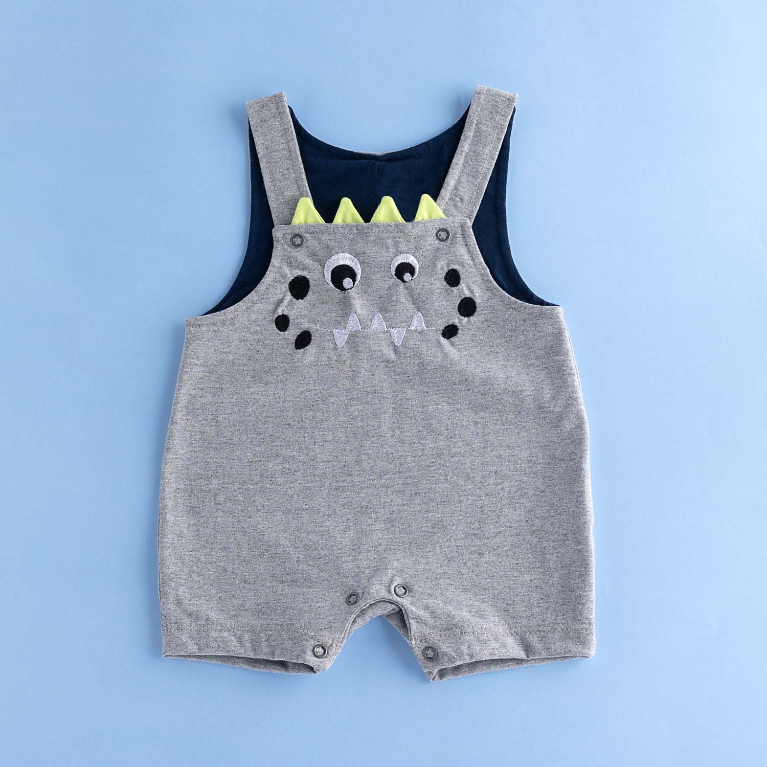 O macacãozinho também possui fechamento com botões de pressão na parte inferior, mangas curtas fresquinhas e um bordado de dinossauro encantador.