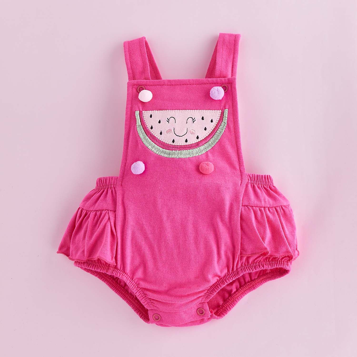 O macacãozinho também possui fechamento com botões de pressão nas alças e na parte inferior, um bordado divertido e colorido de melancia e aplicação de pompons coloridos.