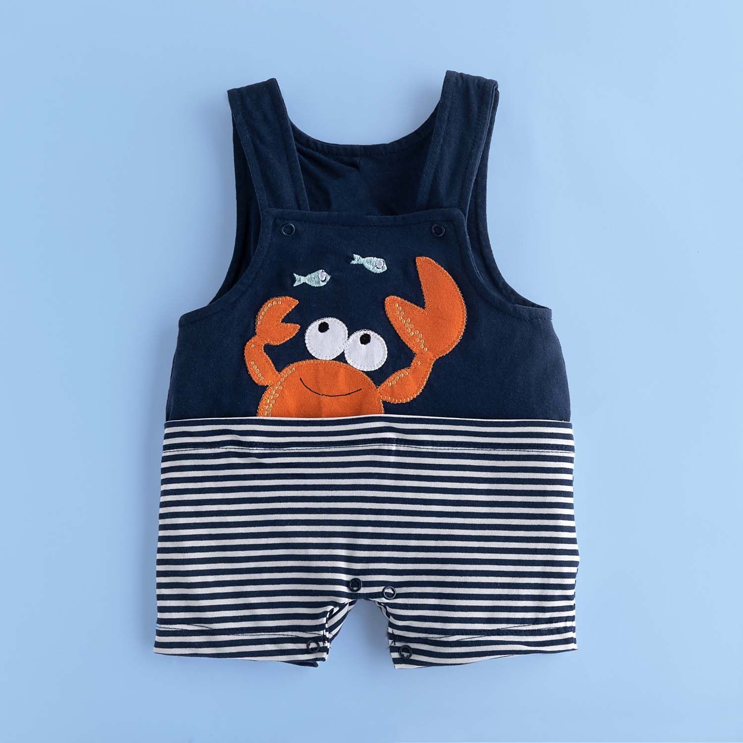O macacãozinho também possui fechamento com botões de pressão na parte inferior, mangas curtas fresquinhas e um bordado de siri com peixinhos por toda a peça.