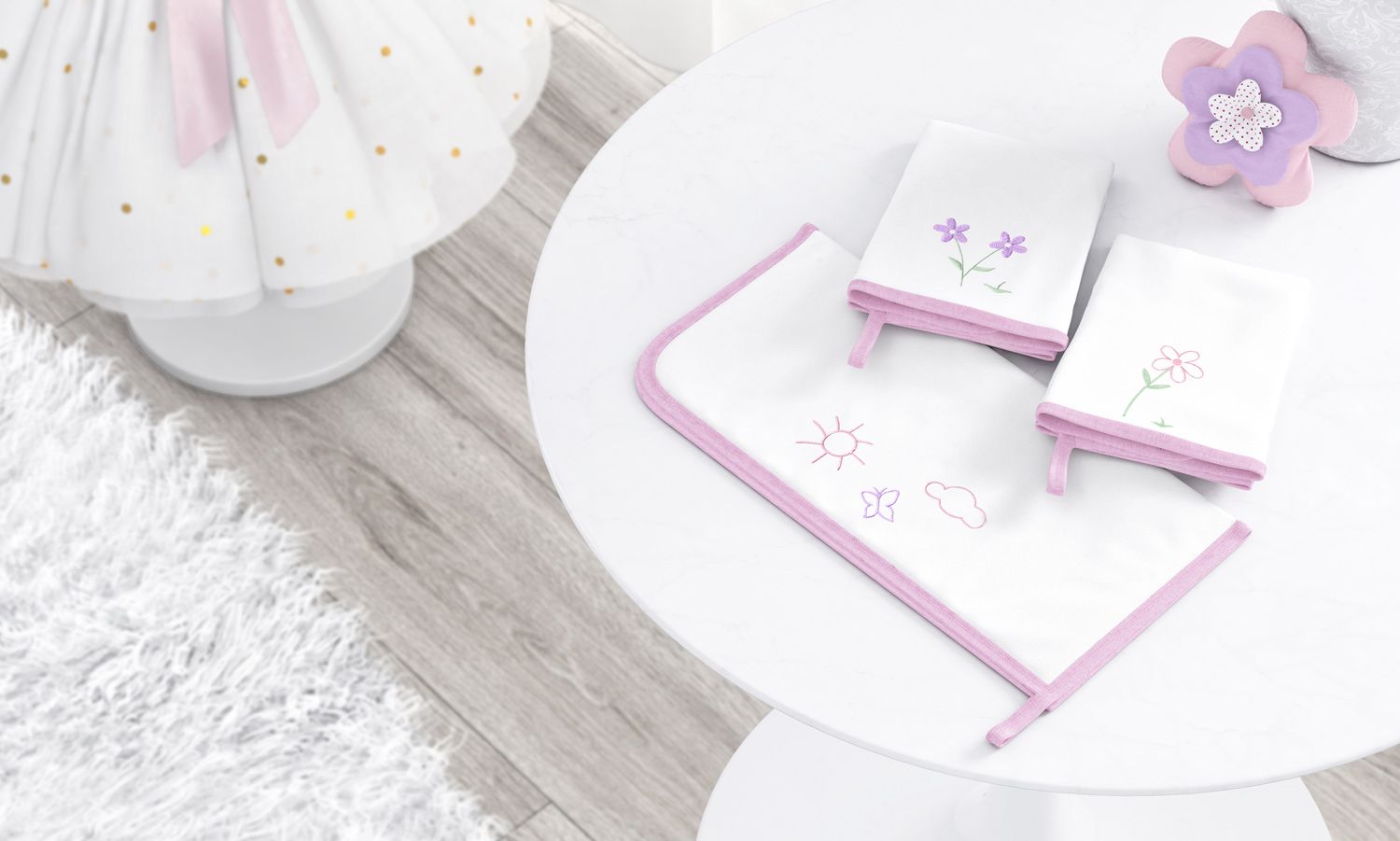 Manter sua princesa limpinha é um cuidado que todas as mamães e papais tem com seu amor. Para evitar que a sua pequenina se suje com golfadas ou babinhas, o Jogo de Fraldas Boca Malha Floral Monet acompanha três funcionais fraldinhas para boca, com um delicado tecido de malha 100% algodão e lindos bordados, como a florzinha, sol, nuvem e borboleta, afinal capricho, qualidade, conforto e bom gosto são algumas das palavras que definem a Grão de Gente!
