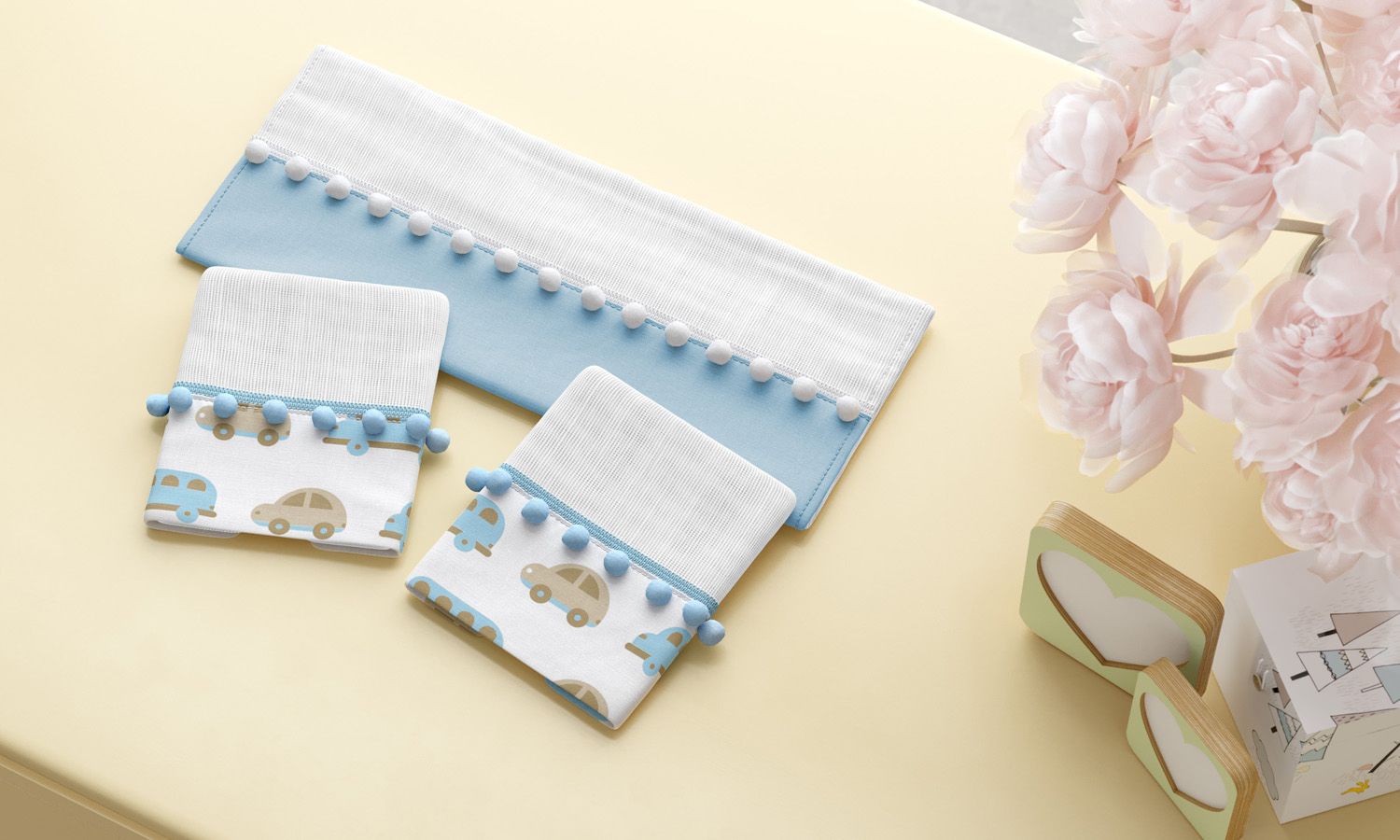 Jogo de Fraldas de Boca Barra Carrinhos Azul com Pompom