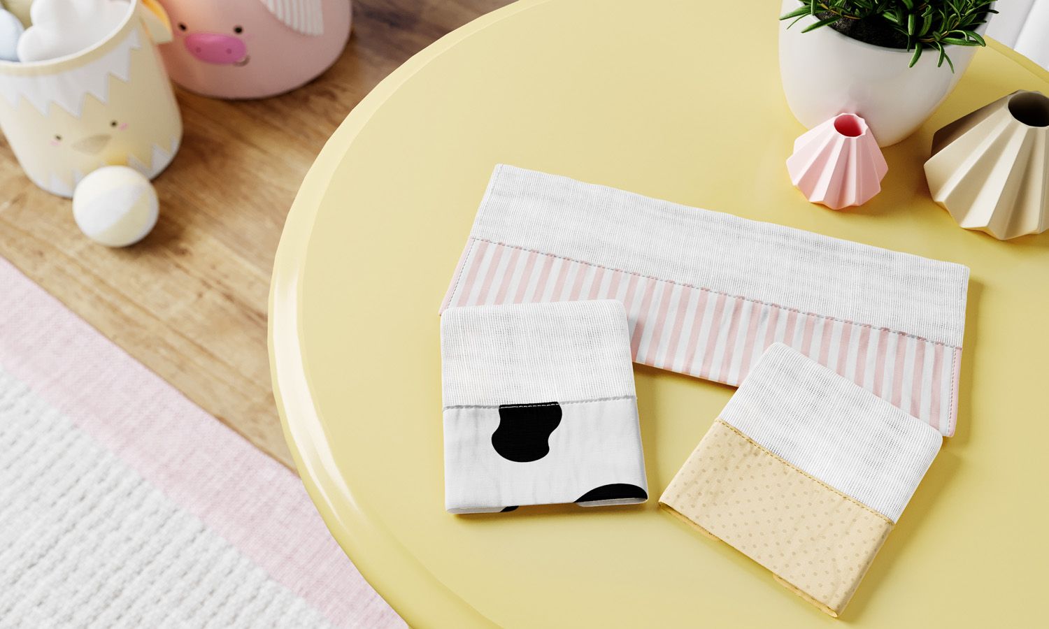 A Coleção Fazendinha conquista pelo carinho e requinte, mas também pela funcionalidade que proporciona para o dia a dia. O Jogo de Fraldas de Boca com Barra Listrada e Estampa Vaquinha se destaca pela praticidade que oferece para as mamães e papais, já que impede que o bebê suje sua roupinha durante a alimentação.