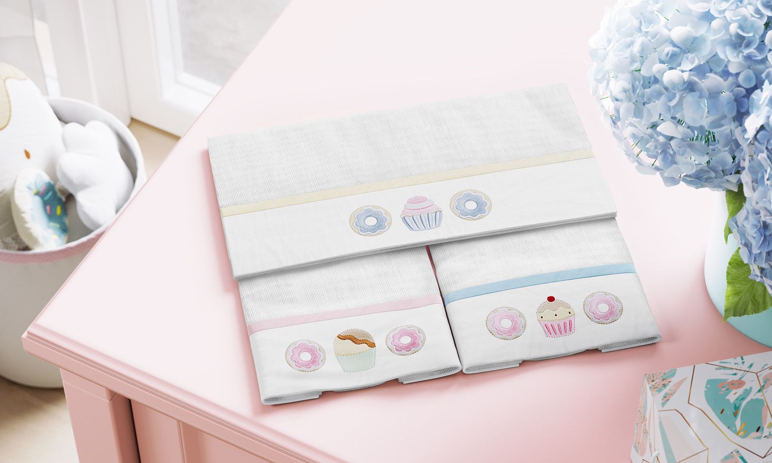 O Jogo de Fraldas de Boca Doce Encanto é composto por três lindas fraldinhas 100% algodão bordadas com docinhos, como cupcakes, donuts e bombons. Esse conjunto é perfeito para levar na bolsa e limpar a boquinha da bebê com muito estilo!