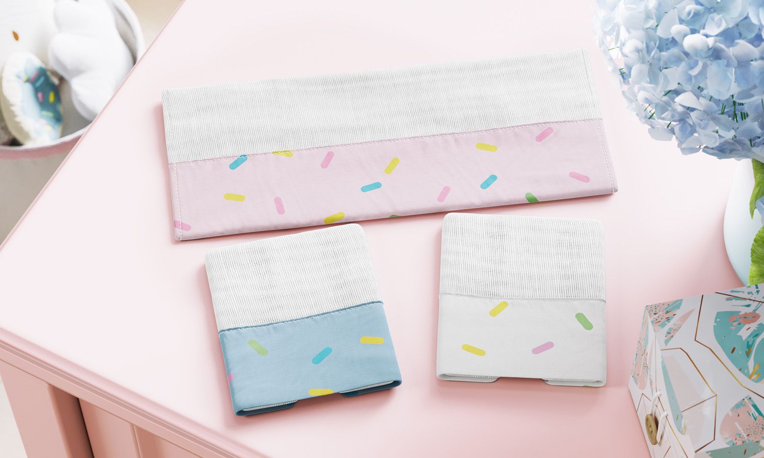 O Jogo de Fraldas de Boca Granulado Colorido é composto por três lindas fraldinhas 100% algodão com barra estampada de confeito. Esse conjunto faz parte da Coleção Doce Encanto e é perfeito para levar na bolsa e limpar a boquinha da bebê com muito estilo!