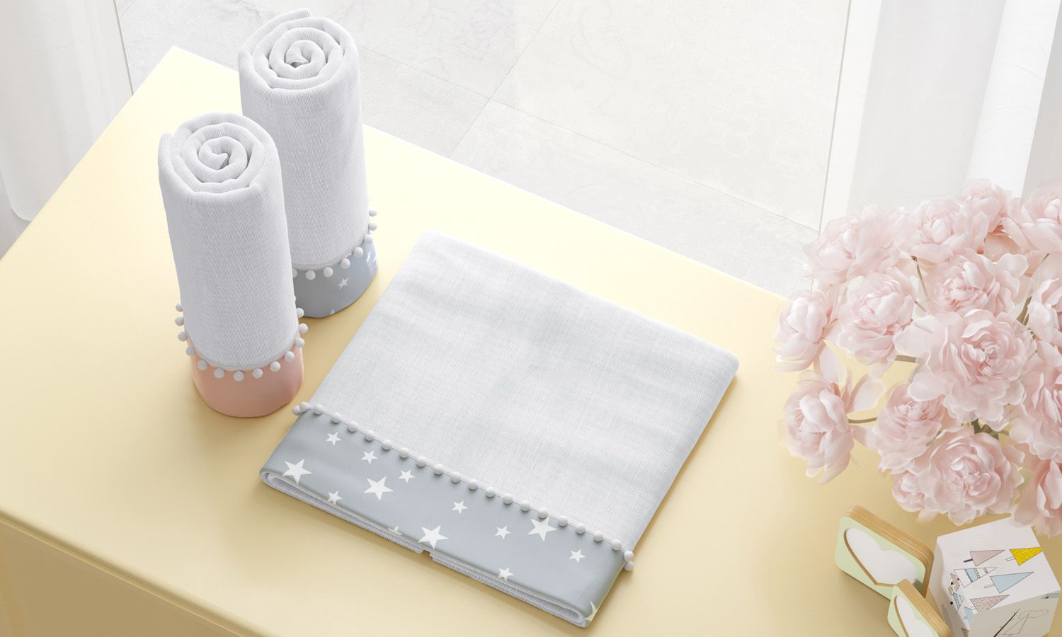 Suavidade em cada detalhe! Nosso conjunto com três fraldas de ombro reúne a leveza do tecido 100% algodão e uma estampa exclusiva Grão de Gente para completar o enxoval do seu amor. As peças são perfeitas para a rotina de cuidados com a pequena, já que sua composição é ideal ao toque sensível da pele dos recém-nascidos.