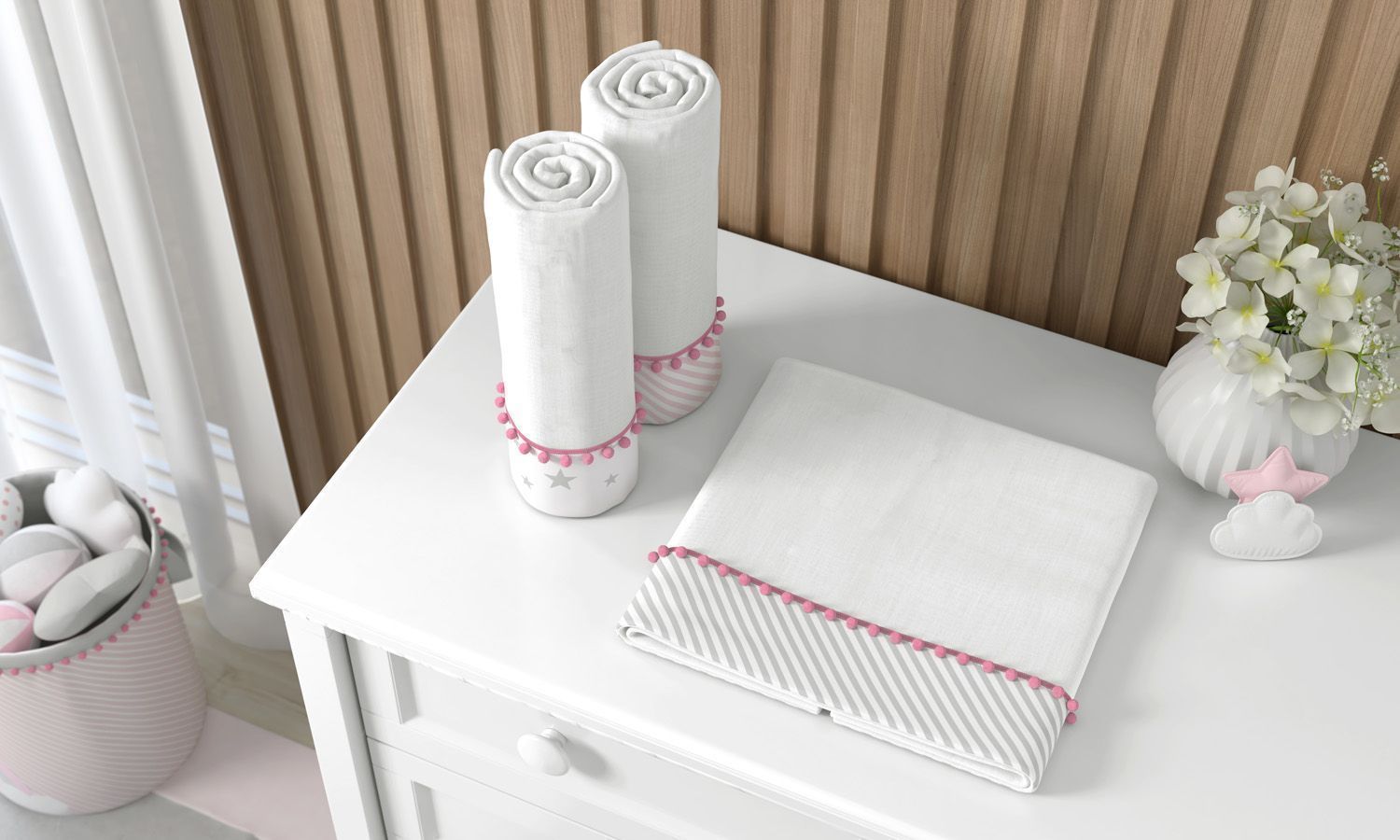 Pronto para manter sua princesa sempre limpinha e confortável, o Jogo de Fraldas de Ombro Barra Listras e Estrelinhas com Pompom reuniu o que as mamães sonham: amor, delicadeza e personalidade! Confeccionadas em tecido 100% algodão, as três peças com tamanho G respeitam a pele sensível da recém-nascida e facilitam a rotina da família, já que enrolam o bebê, limpam babinhas, sujeiras e forram assentos.