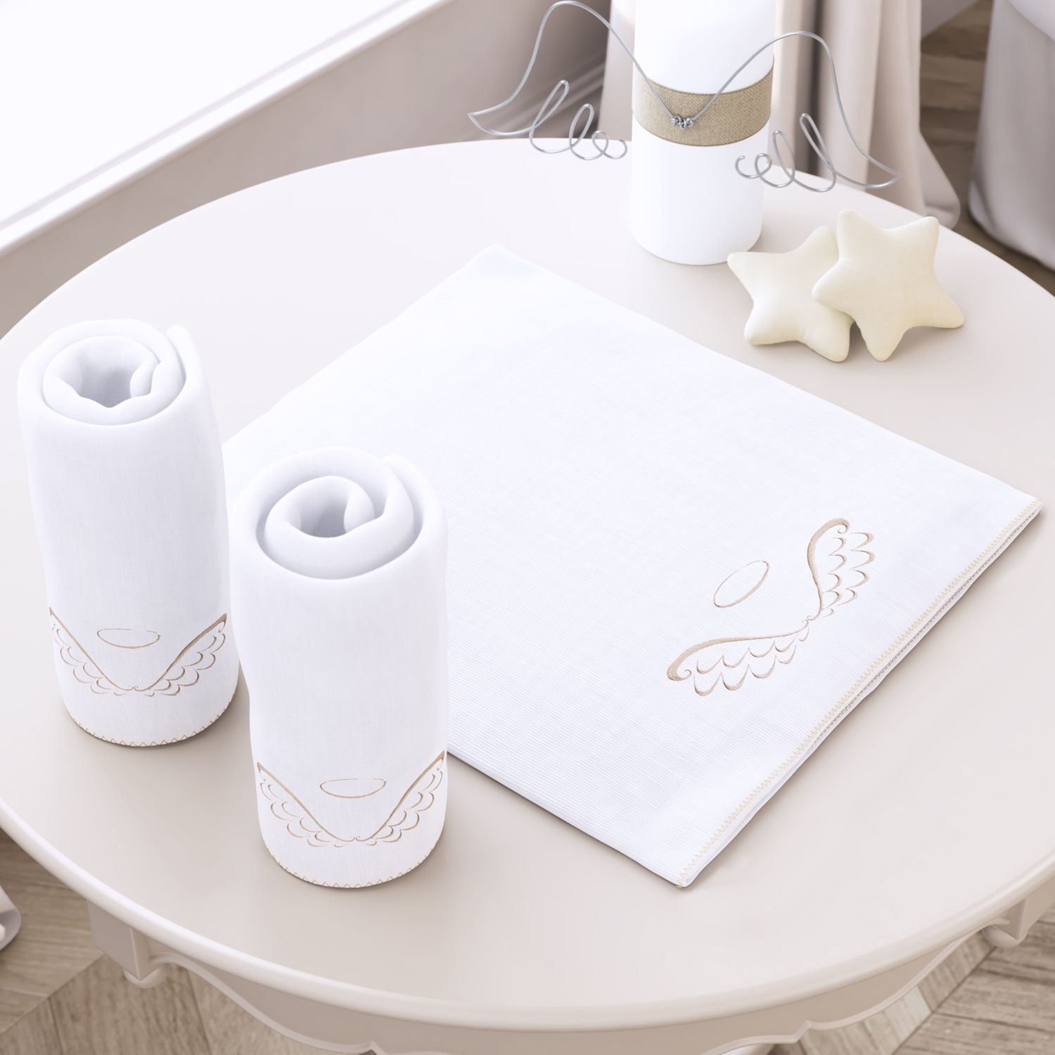 O Jogo de Fraldas de Ombro da Coleção Anjo chegou para adicionar uma pitada de capricho ao enxoval de bebê! Esse acessório coringa auxilia no dia-a-dia e torna a rotina de cuidados mais prática, seja para limpar as babinhas do bebê e sujeiras inevitáveis na hora de papar ou forrar o trocador, assentos de carrinhos de supermercado e até mesmo o estofado da cadeirinha do carro. O conjunto exclusivo da Grão de Gente é composto por três fraldinhas, 100% algodão, bordadas com uma delicada asinha de anjo e uma singela auréola, que dá o toque final de elegância e meiguice. Aproveite para conhecer todos os produtos desta linha delicada, desenhada e confeccionada especialmente para as mamães e papais mais exigentes.