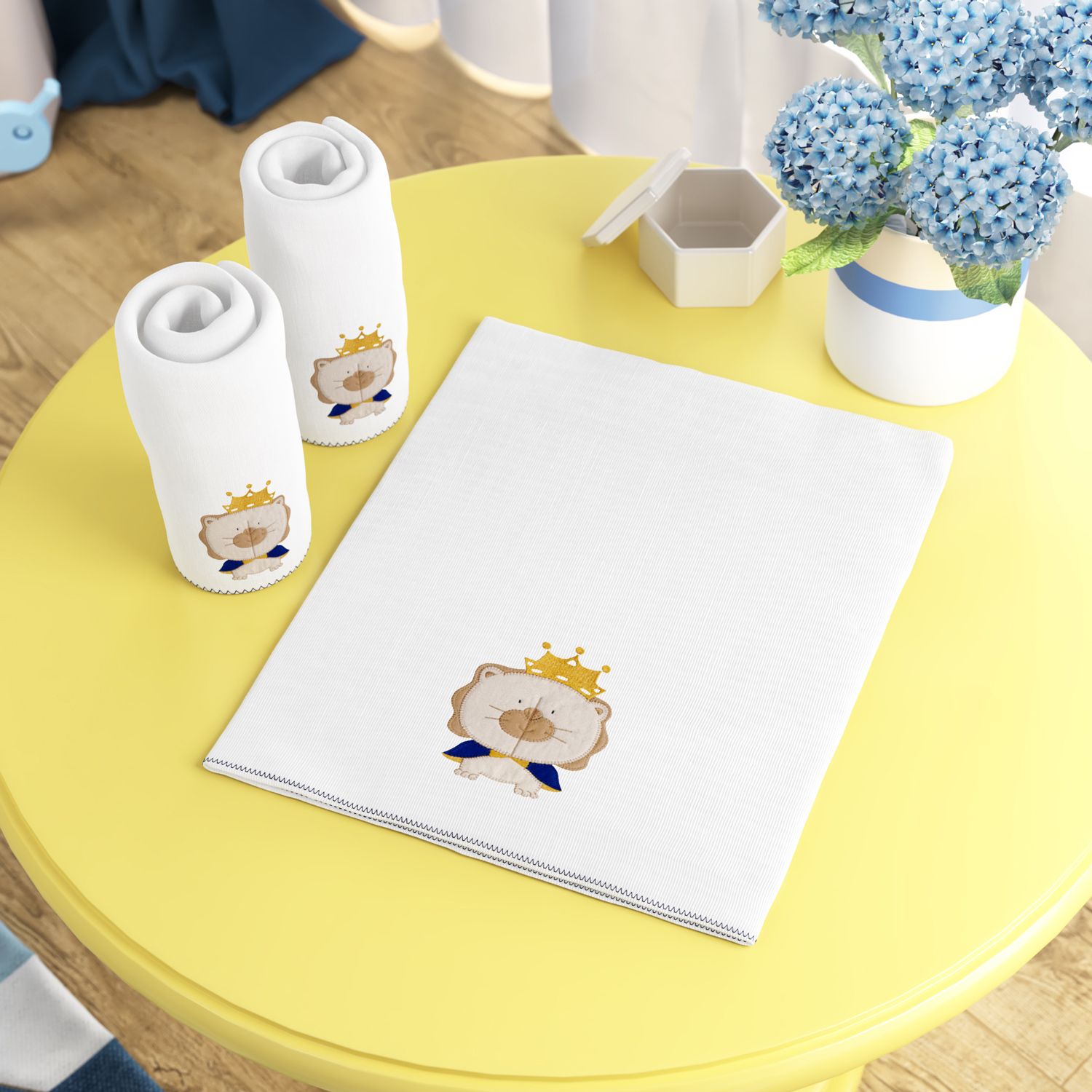 Esse modelo exclusivo, com 3 fraldinhas tamanho G, vai auxiliar as mamães a manter o bebê sempre limpinho e confortável, sem esquecer do requinte. Um simpático leãozinho com coroa enfeita o acessório num bordado incrível. O tecido 100% algodão respeita a pele do nenê e garante o conforto e aconchego do pequeno.