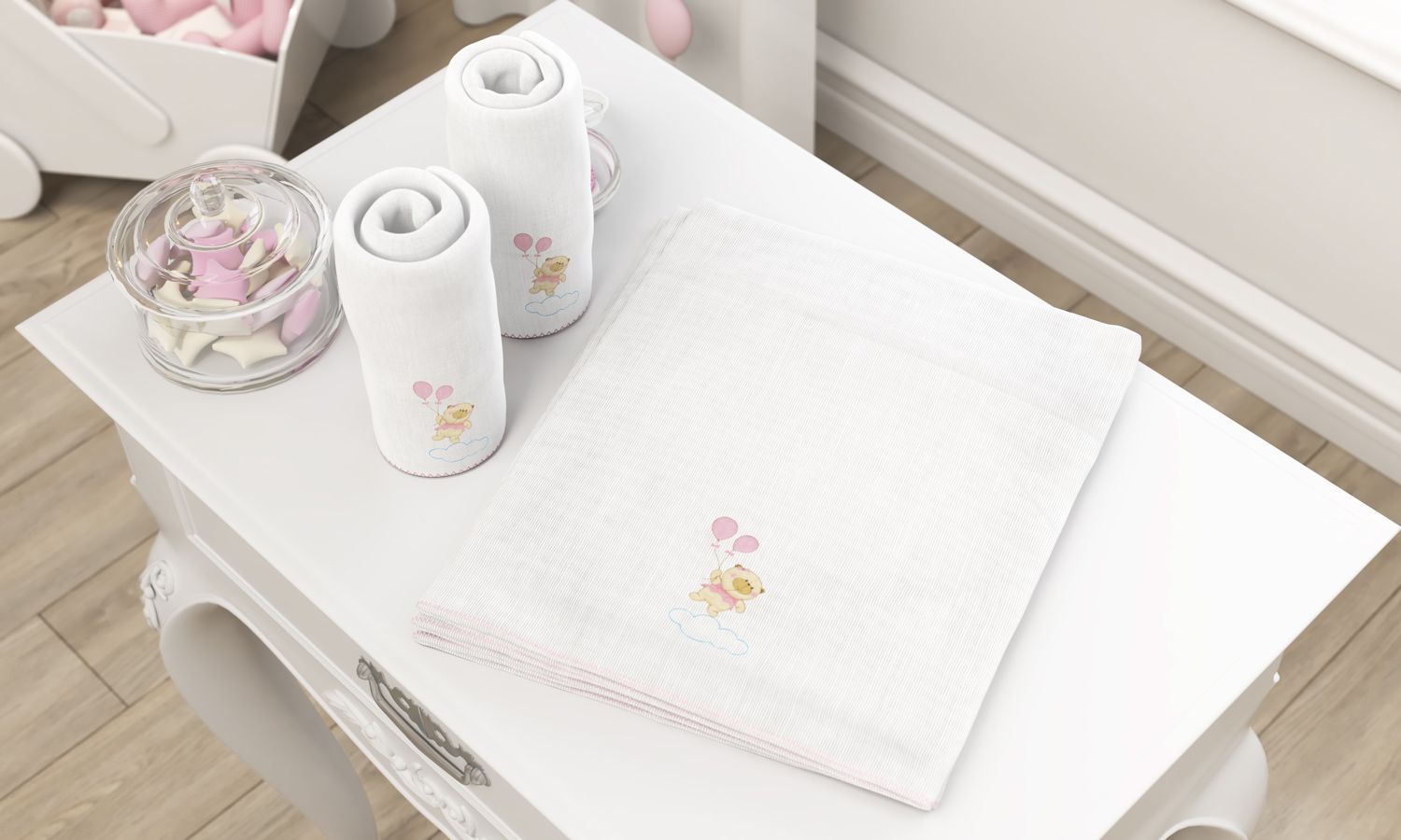 O Jogo de Fraldas Ombro Ursinha Nina e o Balão com 5 está entre os itens mais importantes e funcionais do enxoval, pois será seu aliado em diversas ocasiões. As mamães mais experientes e as vovós já sabem que precisamos manter uma boa quantidade de fraldas de pano sempre por perto, na bolsa maternidade e em casa. Com elas, podemos proteger a bebê do sol e do vento em excesso, forrar o trocador, o estofado da cadeirinha do carro e até os assentos dos carrinhos de supermercado. Esses modelos são produzidos com tecidos 100% algodão, são maiores que as fraldas de boca e decoradas com o bordado de ursinha exclusivo da coleção.