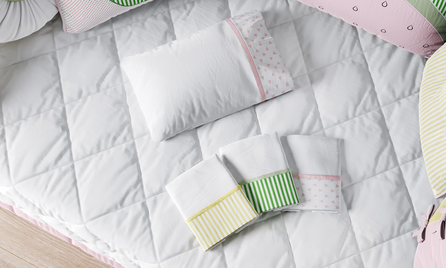 Com o Jogo de Fronhas Listras e Triângulos o enxoval de bebê fica mais completo. As peças são confeccionadas com a maciez do tecido 100% algodão e permitem forrar o travesseiro do bebê de maneira aconchegante. Listras e triângulos enfeitam as fronhas.