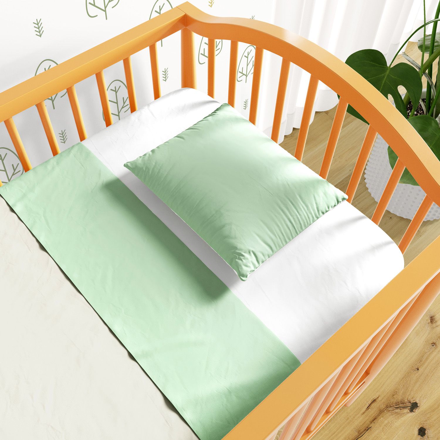 O conjunto vem com três peças essenciais para o berço: lençol de baixo branco com elástico, lençol de cima amarelo com vira verde e fronha verde lisa.