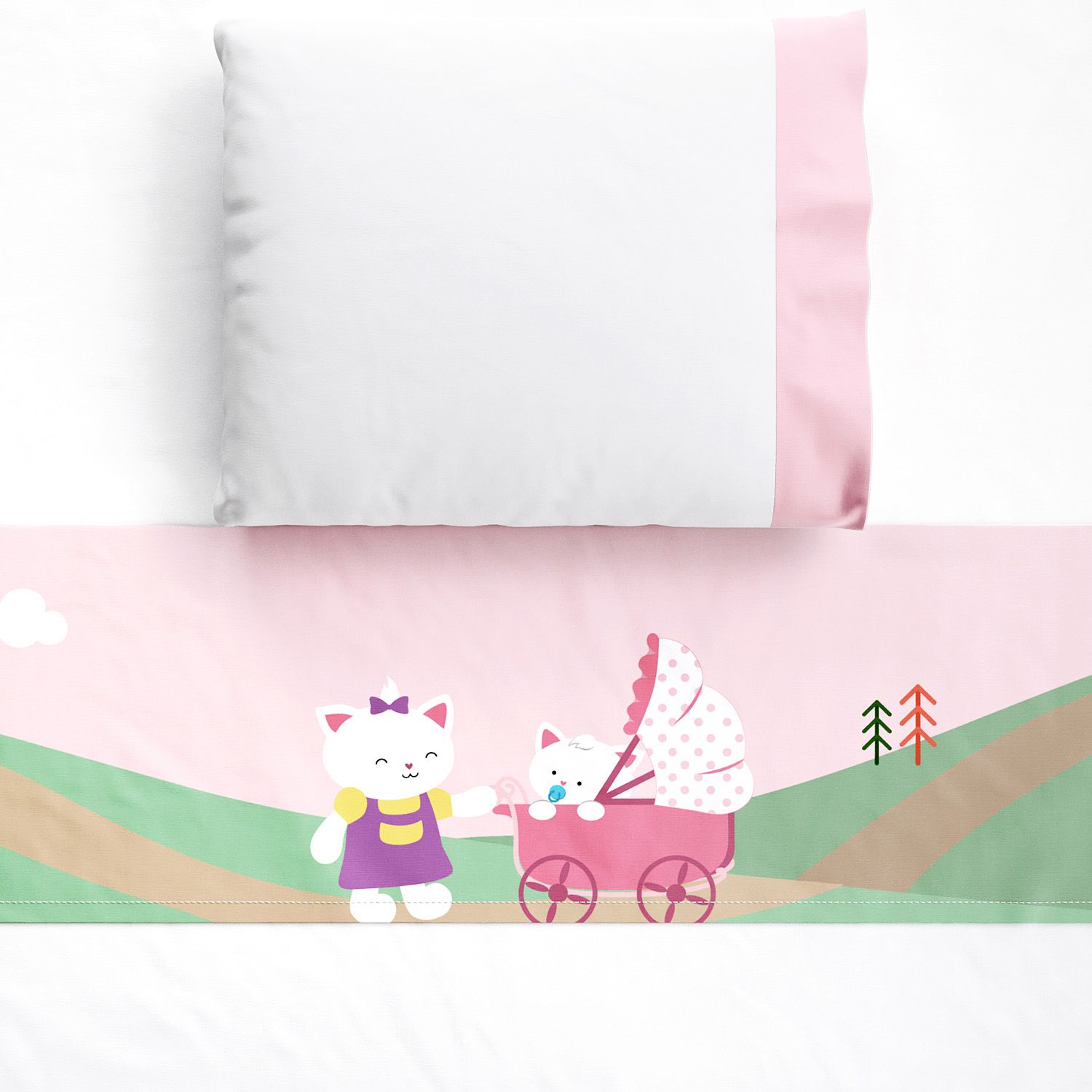 O Jogo de Lençol Berço Bebê e Mamãe Gatinhas é um conjunto completo para o enxoval do bebê dos sonhos! Ele vem com três peças essenciais para o berço: lençol de baixo branco com elástico, lençol de cima branco com vira estampada e fronha branca com faixa rosa.