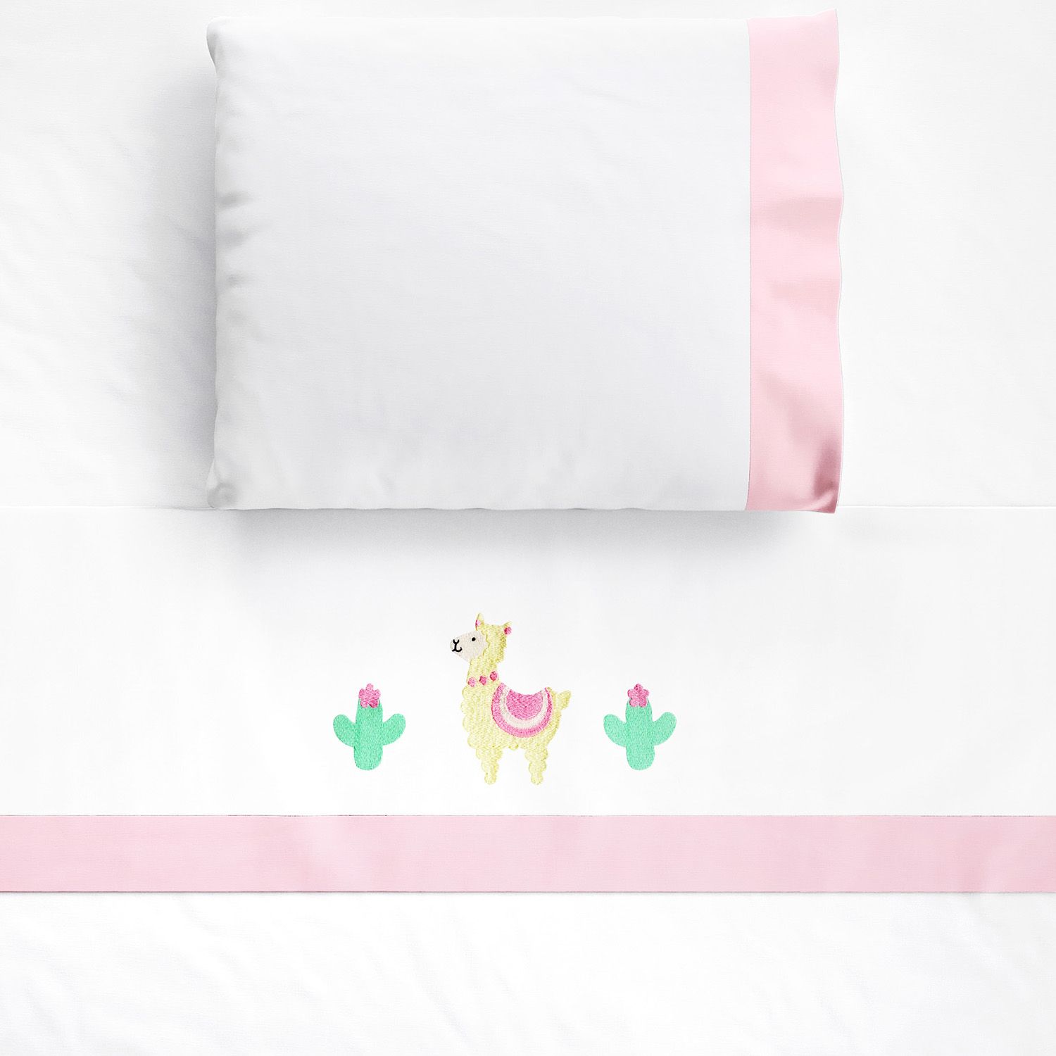 O Jogo Lençol de Berço Bordado Amiguinhas Lhamas completa o enxoval do bebê com o conforto do tecido 100% algodão percal 180 fios. O conjunto vem com três peças essenciais para o berço: lençol de baixo branco com elástico, lençol de cima com vira branca, bordados de lhama e cactos, faixa rosa e fronha branca com faixa rosa.