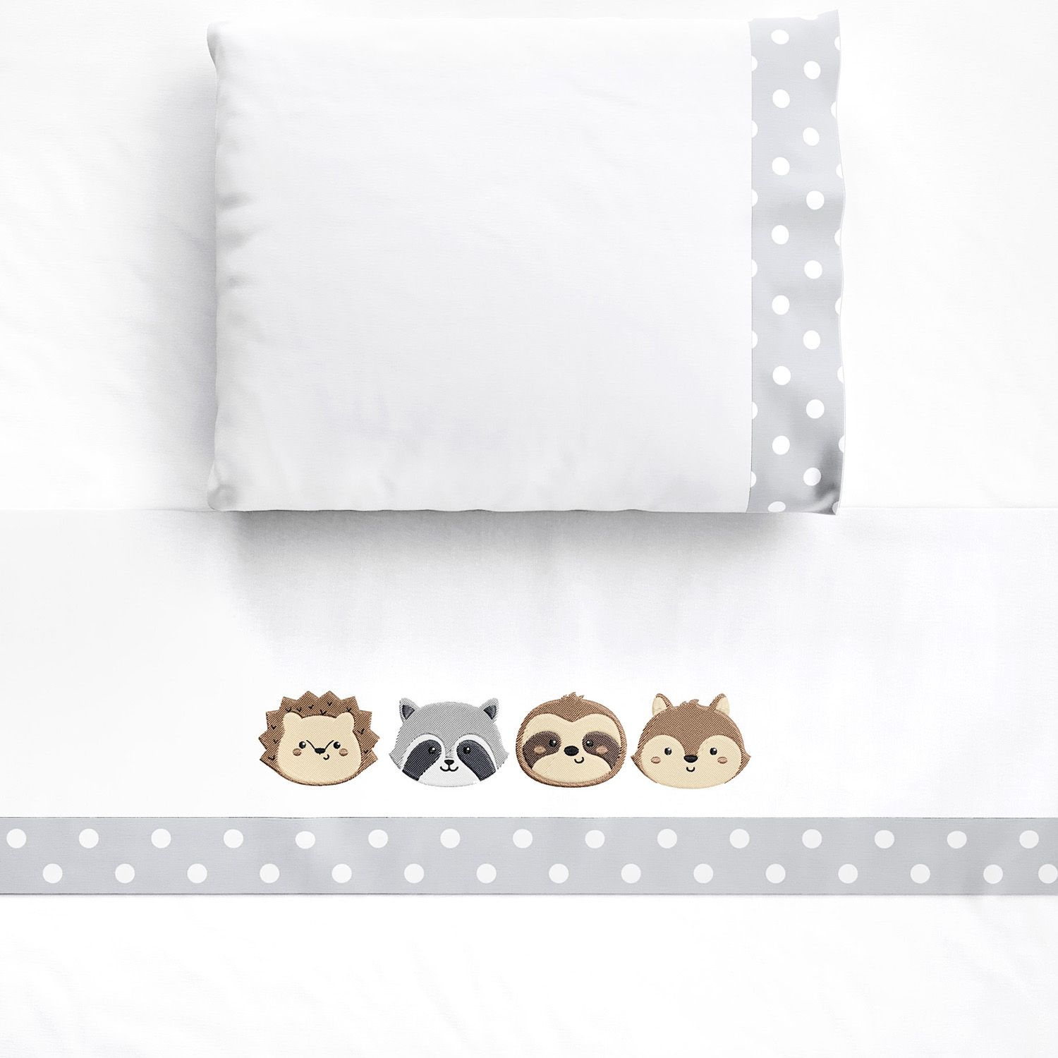 O Jogo Lençol de Berço Bordado Amiguinhos do Bosque completa o enxoval do bebê com o conforto do tecido 100% algodão percal 180 fios. O conjunto vem com três peças essenciais para o berço: lençol de baixo branco com elástico, lençol de cima com vira bordada e faixa cinza com poás e fronha branca com faixa cinza com poás.