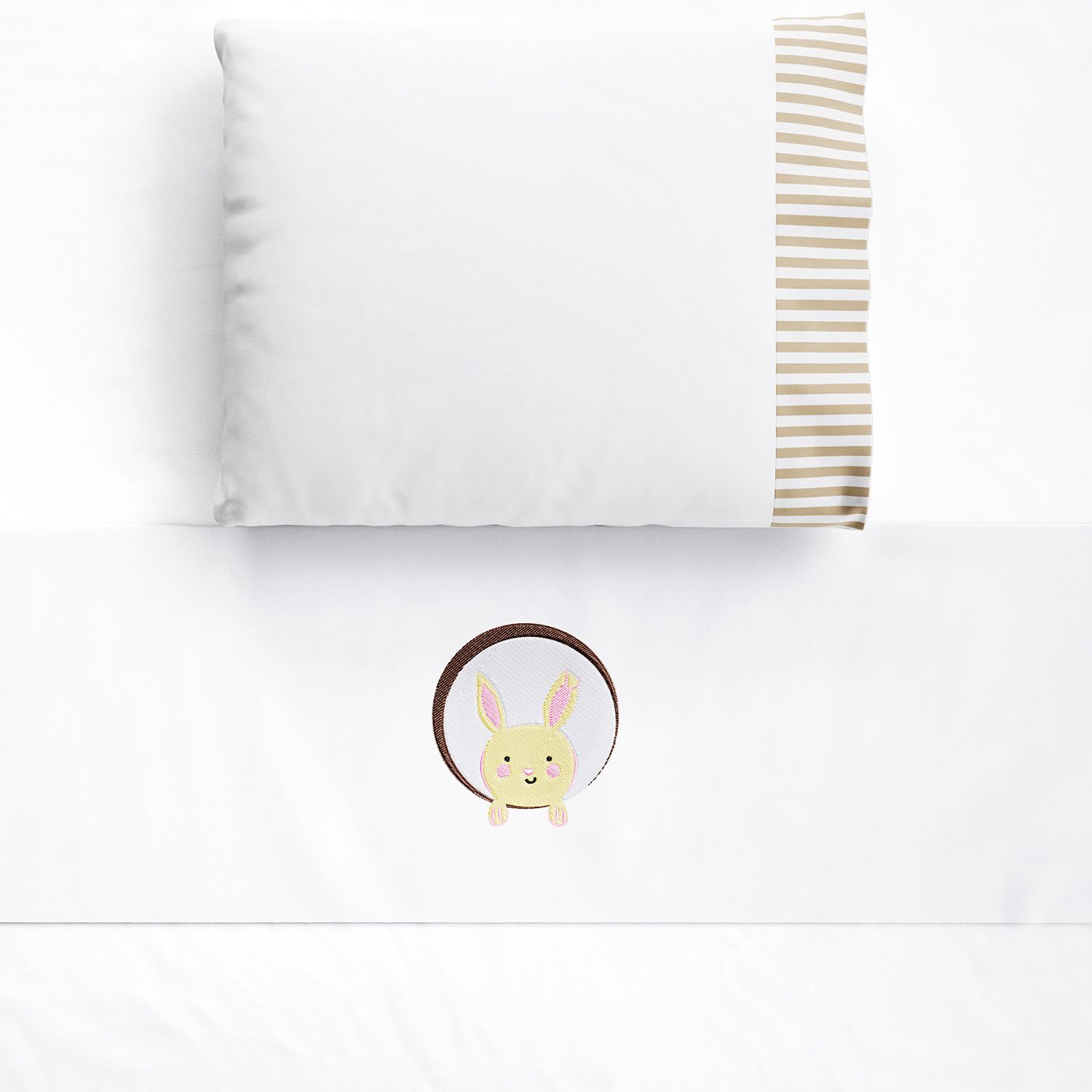 O Jogo Lençol de Berço Bordado Coelhinho completa o enxoval do bebê com o conforto do tecido 100% algodão percal 180 fios. O conjunto vem com três peças essenciais para o berço: lençol de baixo branco com elástico, lençol de cima com vira branca com bordado de coelhinho e fronha branca com faixa listrada branco e bege.