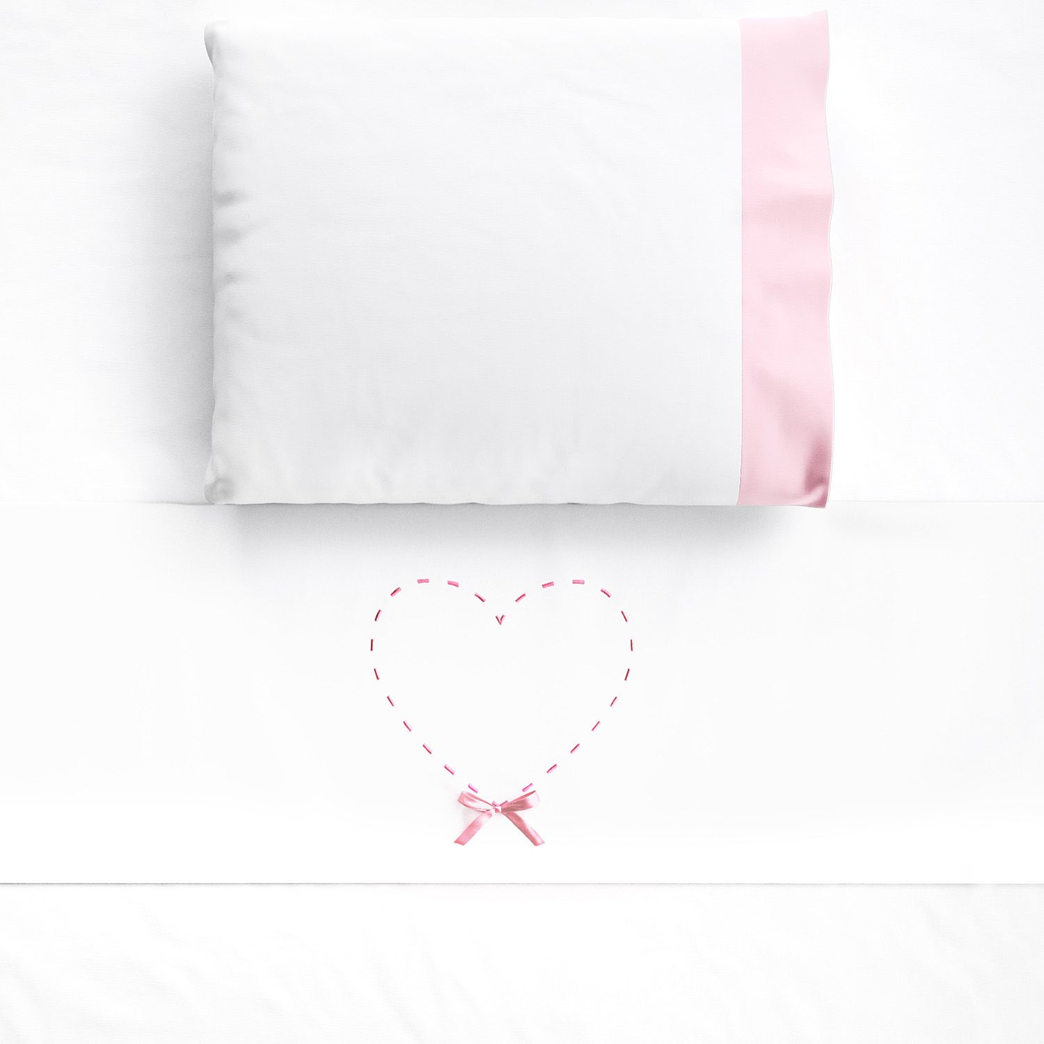 O Jogo Lençol de Berço Bordado Coração completa o enxoval do bebê com o conforto do tecido 100% algodão percal 180 fios. O conjunto vem com três peças essenciais para o berço: lençol de baixo branco com elástico, lençol de cima com vira branca, bordado de coração e aplique de laço de cetim e fronha branca com faixa rosa.