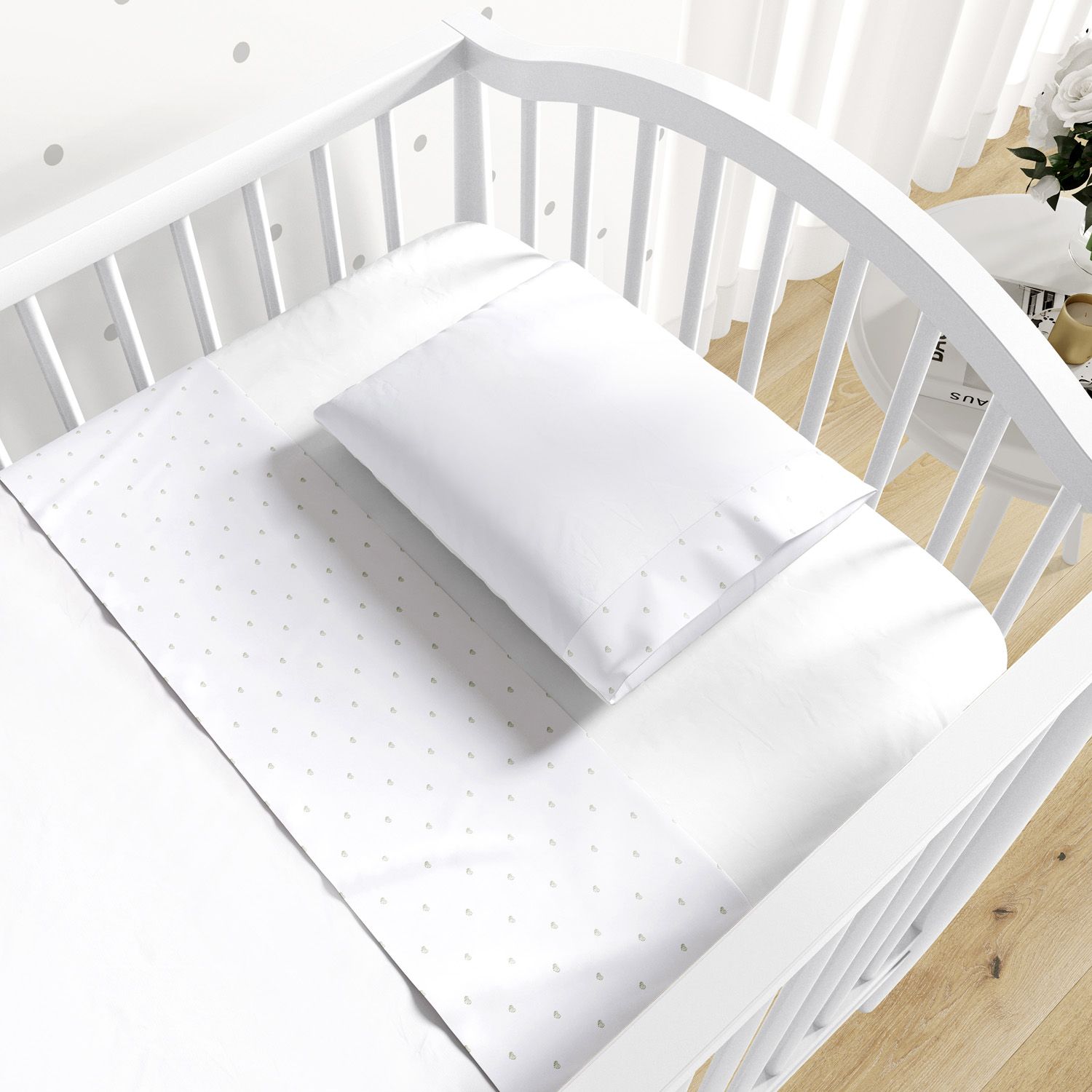 O Jogo Lençol de Berço Bordado Coração Petit completa o enxoval do bebê com o conforto do tecido 100% algodão percal 200 fios. O conjunto vem com três peças essenciais para o berço: lençol de baixo branco com elástico, lençol de cima com vira branca com bordados de corações e fronha branca com faixa bordada.