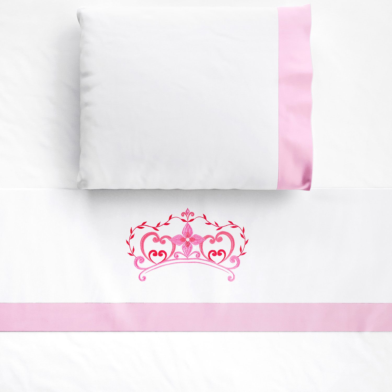 O Jogo de Lençol Berço Bordado Coroa completa o enxoval do bebê com o conforto do tecido 100% algodão percal 180 fios. O conjunto vem com três peças essenciais para o berço: lençol de baixo branco com elástico, lençol de cima com vira rosa e bordado de coroa e fronha branca com faixa rosa.