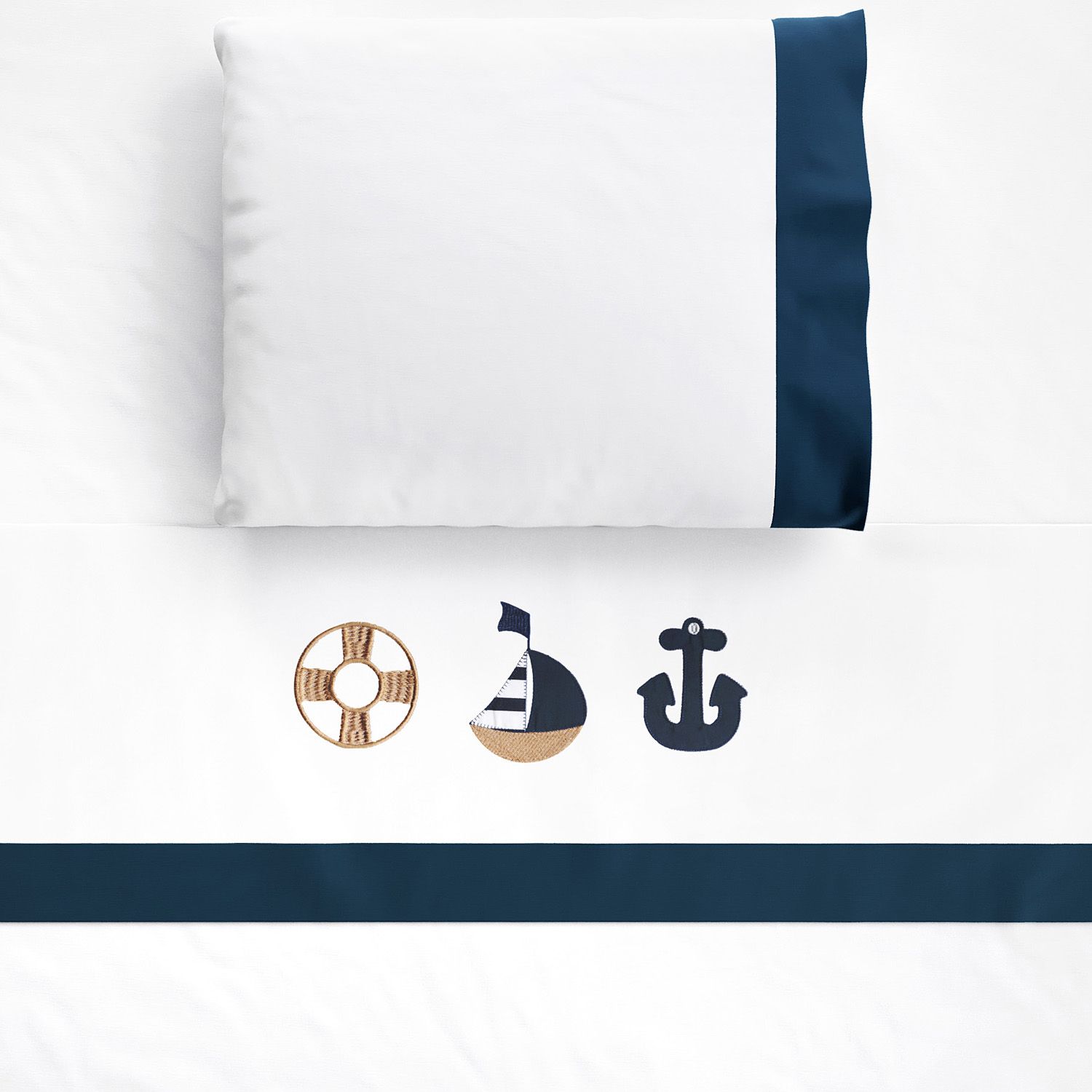O Jogo Lençol de Berço Bordado Marinheiro completa o enxoval do bebê com o conforto do tecido 100% algodão percal 180 fios. O conjunto vem com três peças essenciais para o berço: lençol de baixo branco com elástico, lençol de cima com vira branca, faixa azul marinho e bordado de boia, barco e âncora e fronha branca com faixa azul marinho.