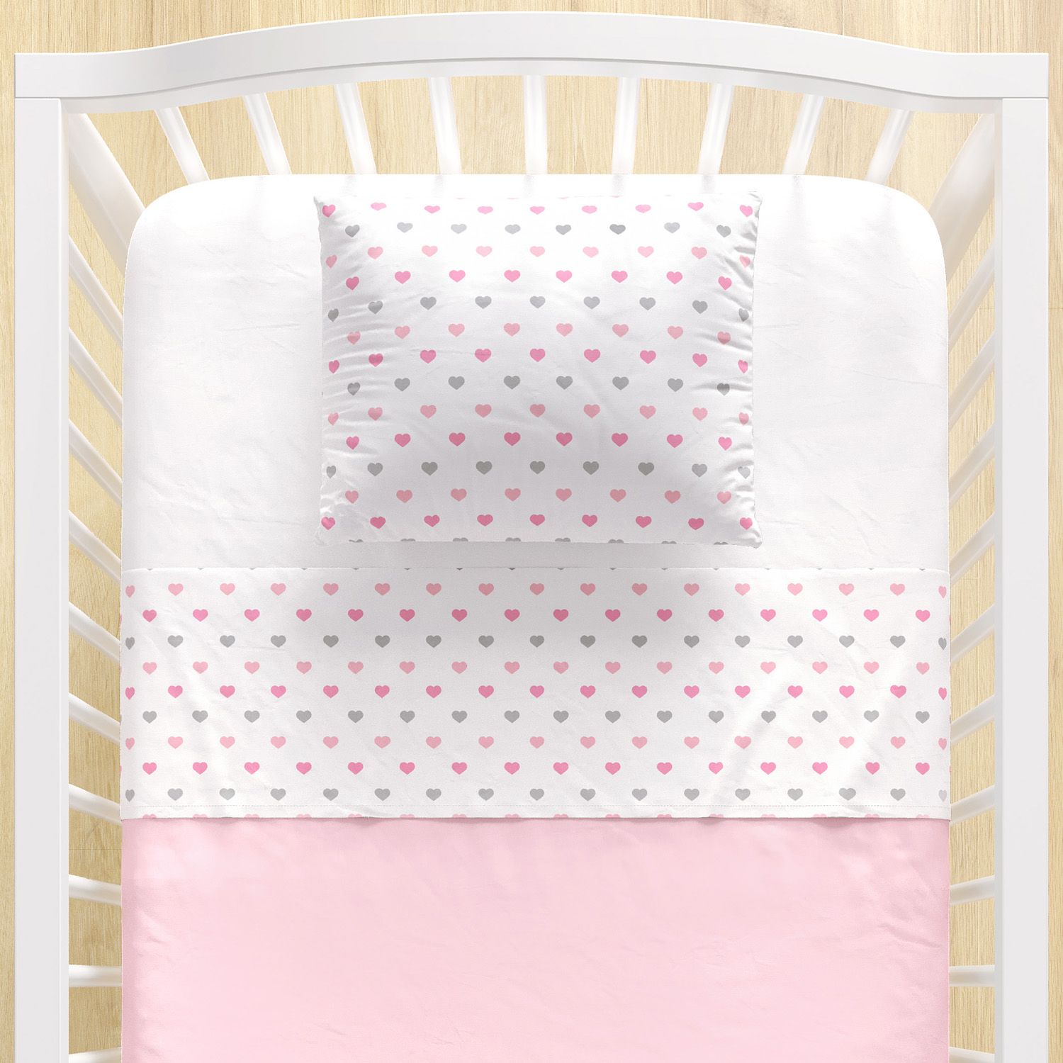 O Jogo de Lençol Berço Corações completa o enxoval do bebê com o conforto do tecido 100% algodão percal 180 fios. O conjunto vem com três peças essenciais para o berço: lençol de baixo branco com elástico, lençol de cima rosa com vira de corações e fronha com corações.