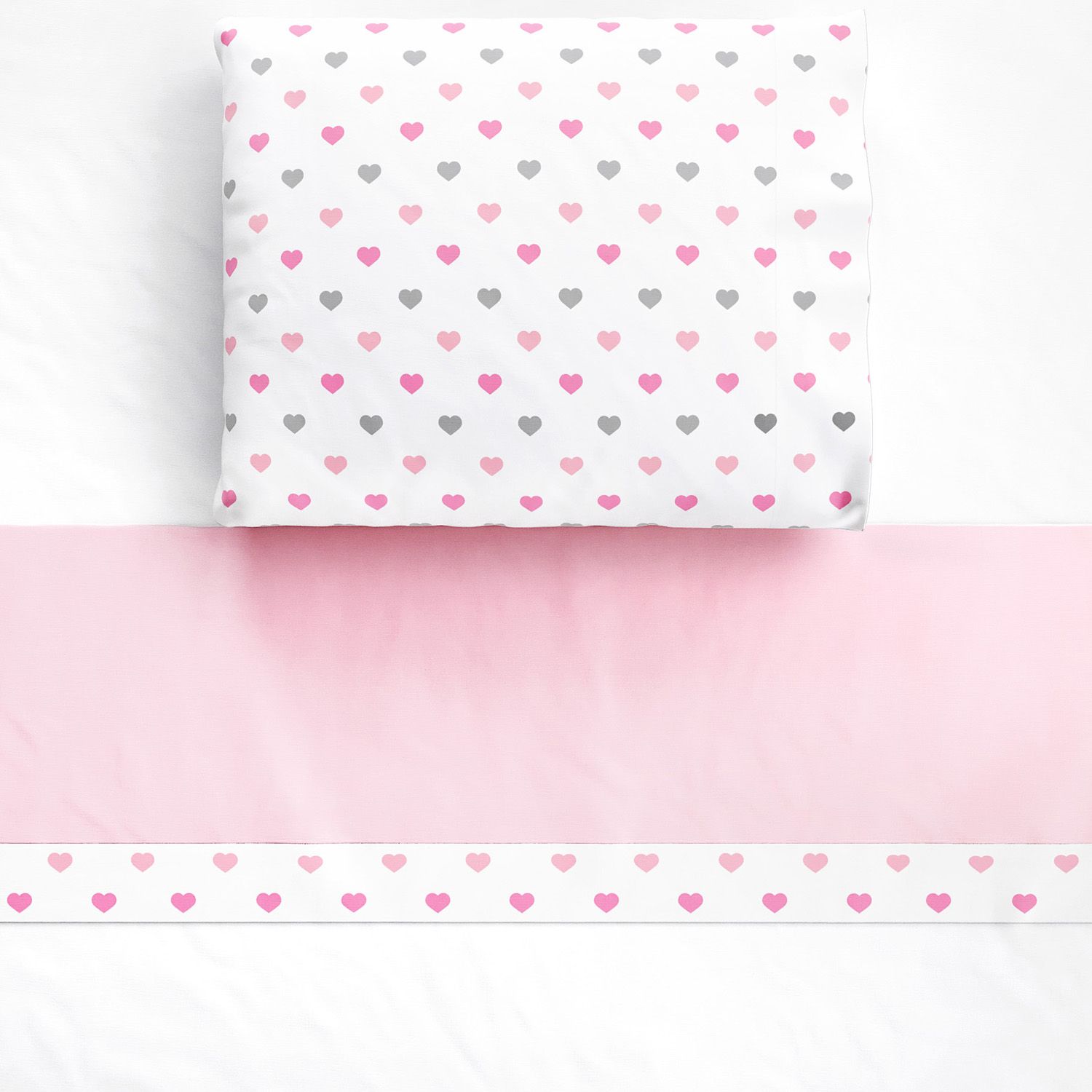 O Jogo Lençol de Berço Corações Rosa completa o enxoval do bebê com o conforto do tecido 100% algodão percal 180 fios. O conjunto vem com três peças essenciais para o berço: lençol de baixo branco com elástico, lençol de cima com vira rosa e faixa de corações e fronha branca com corações.
