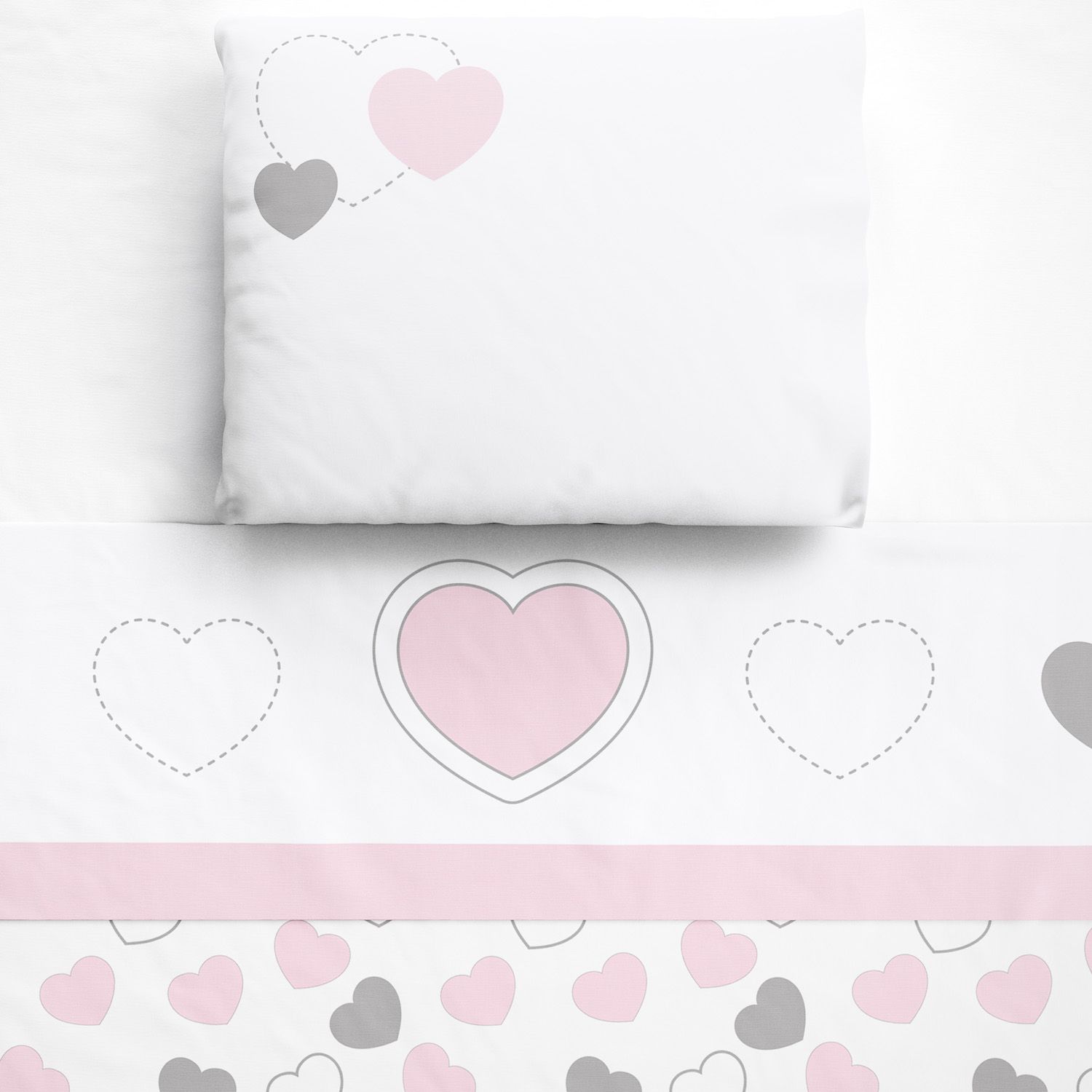 O Jogo de Lençol de Berço Corações Rosa é um conjunto completo para o enxoval do bebê dos sonhos! Ele vem com três peças essenciais para o berço: lençol de baixo branco com elástico, lençol de cima estampado com vira e fronha branca com estampa.