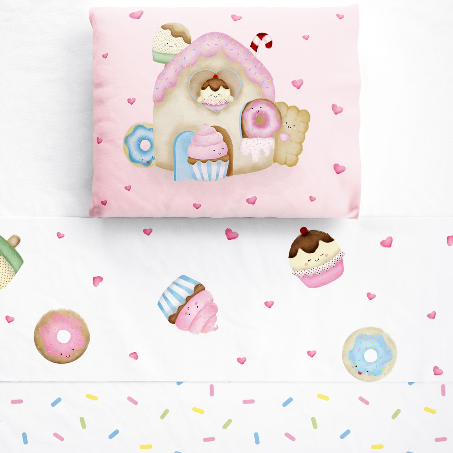 O Jogo de Lençol de Berço Docinhos é um conjunto completo para o enxoval do bebê dos sonhos! Ele vem com três peças essenciais para o berço: lençol de baixo branco com elástico, lençol de cima estampado com vira e fronha rosa com estampa de biscoitos, donuts, sorvete, cupcake e corações.