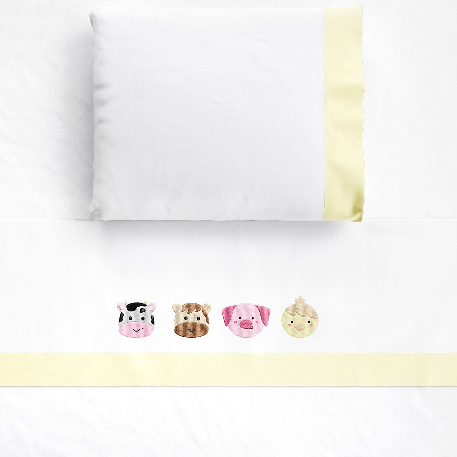 O Jogo de Lençol Berço Fazendinha completa o enxoval do bebê. O conjunto vem com três peças essenciais para o berço: lençol de baixo branco com elástico, lençol de cima com vira branca, faixa amarela e estampa dos Amiguinhos da Fazendinha e fronha branca com faixa amarela.