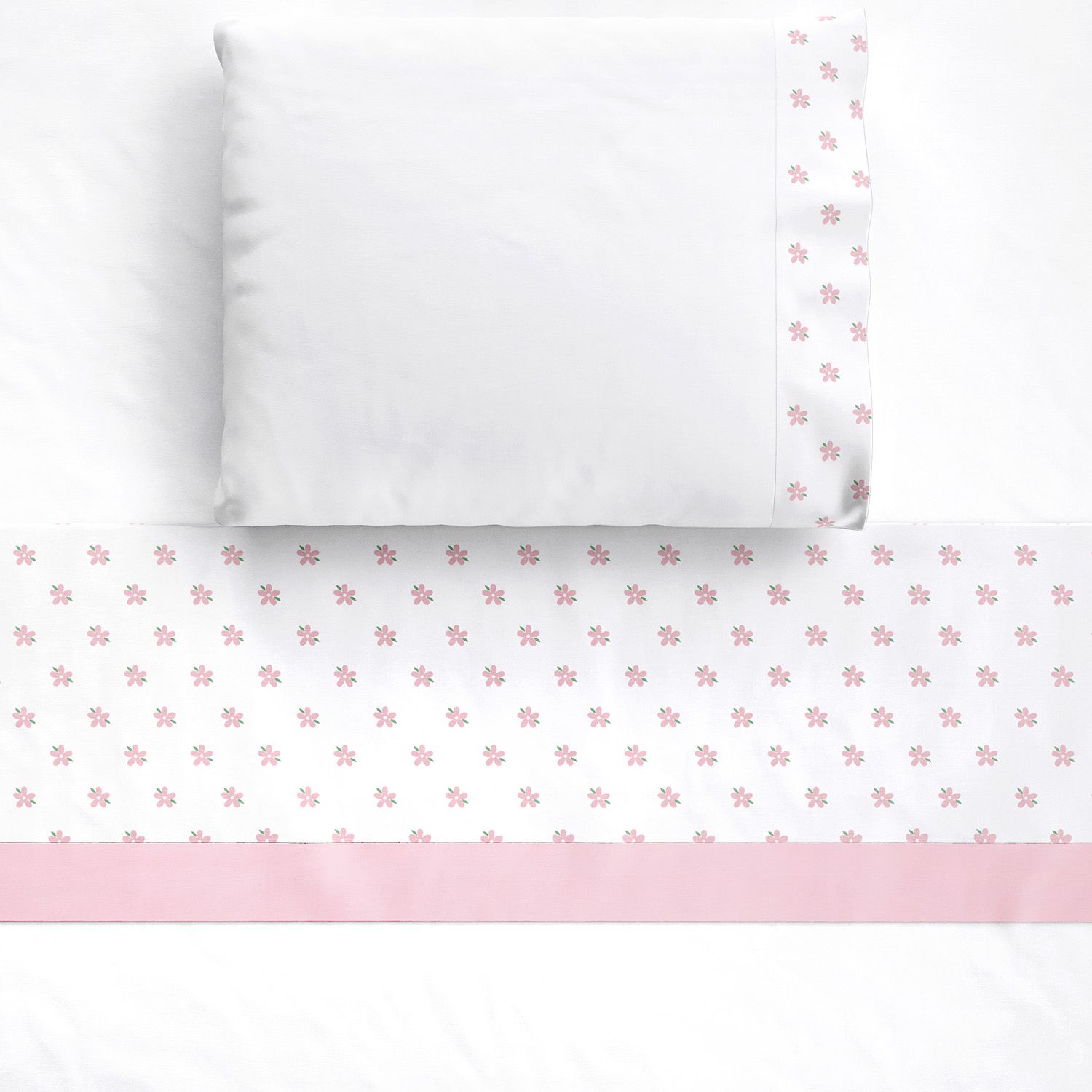 O Jogo de Lençol Berço Floral é um conjunto completo para o enxoval do bebê dos sonhos! Ele vem com três peças essenciais para o berço: lençol de baixo branco com elástico, lençol de cima com vira rosa e estampa floral e fronha branca com faixa floral.