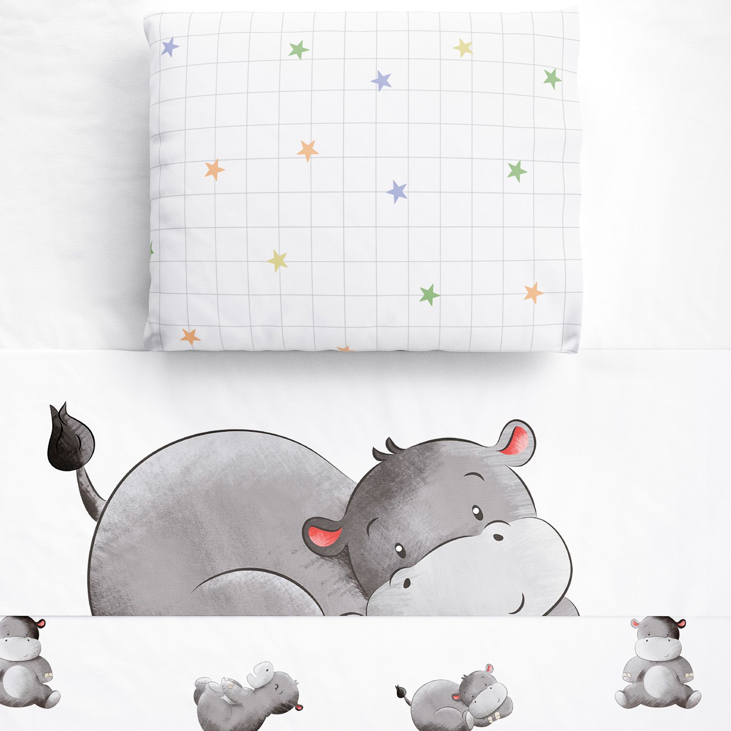 O Jogo de Lençol de Berço Hipopótamo é um conjunto completo para o enxoval do bebê dos sonhos! Ele vem com três peças essenciais para o berço: lençol de baixo branco com elástico, lençol de cima branco estampado com vira e fronha branca geométrica com estrelinhas.