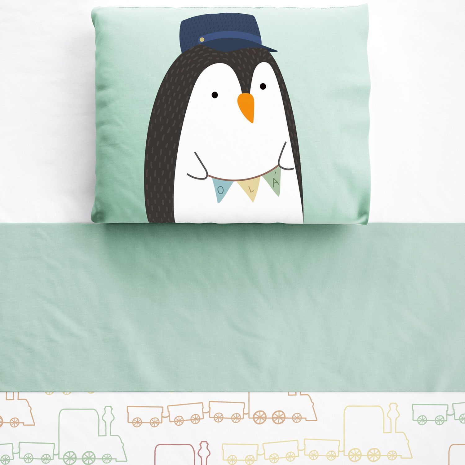 O Jogo de Lençol de Berço Pinguim Maquinista é um conjunto completo para o enxoval do bebê dos sonhos! Ele vem com três peças essenciais para o berço: lençol de baixo branco com elástico, lençol de cima estampado com vira verde e fronha com estampa de pinguim.