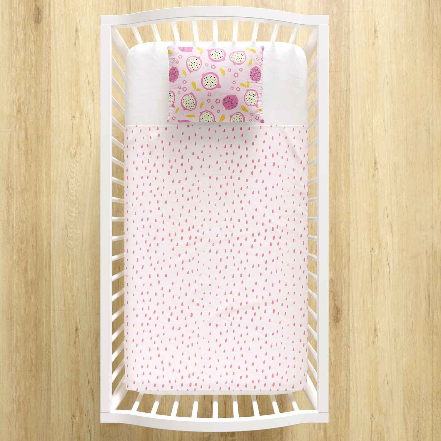 Complete o enxoval com a delicadeza e o conforto do Jogo de Lençol Berço Pitaya Rosa! Além do lençol de baixo branco com elástico, o conjunto encanta com a originalidade das estampas exclusivas de pitaya na fronha e no lençol de cima.