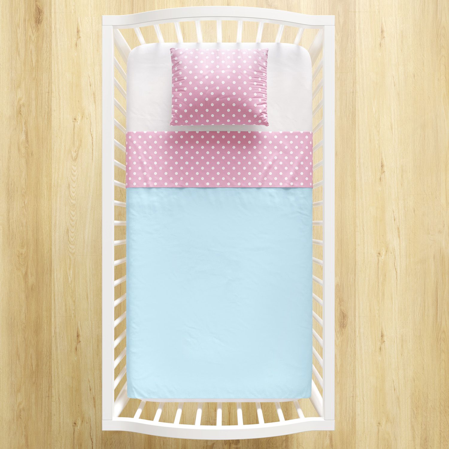 O conjunto vem com três peças essenciais para o berço: lençol de baixo branco com elástico, lençol de cima azul e rosa com vira estampada e fronha rosa poá.