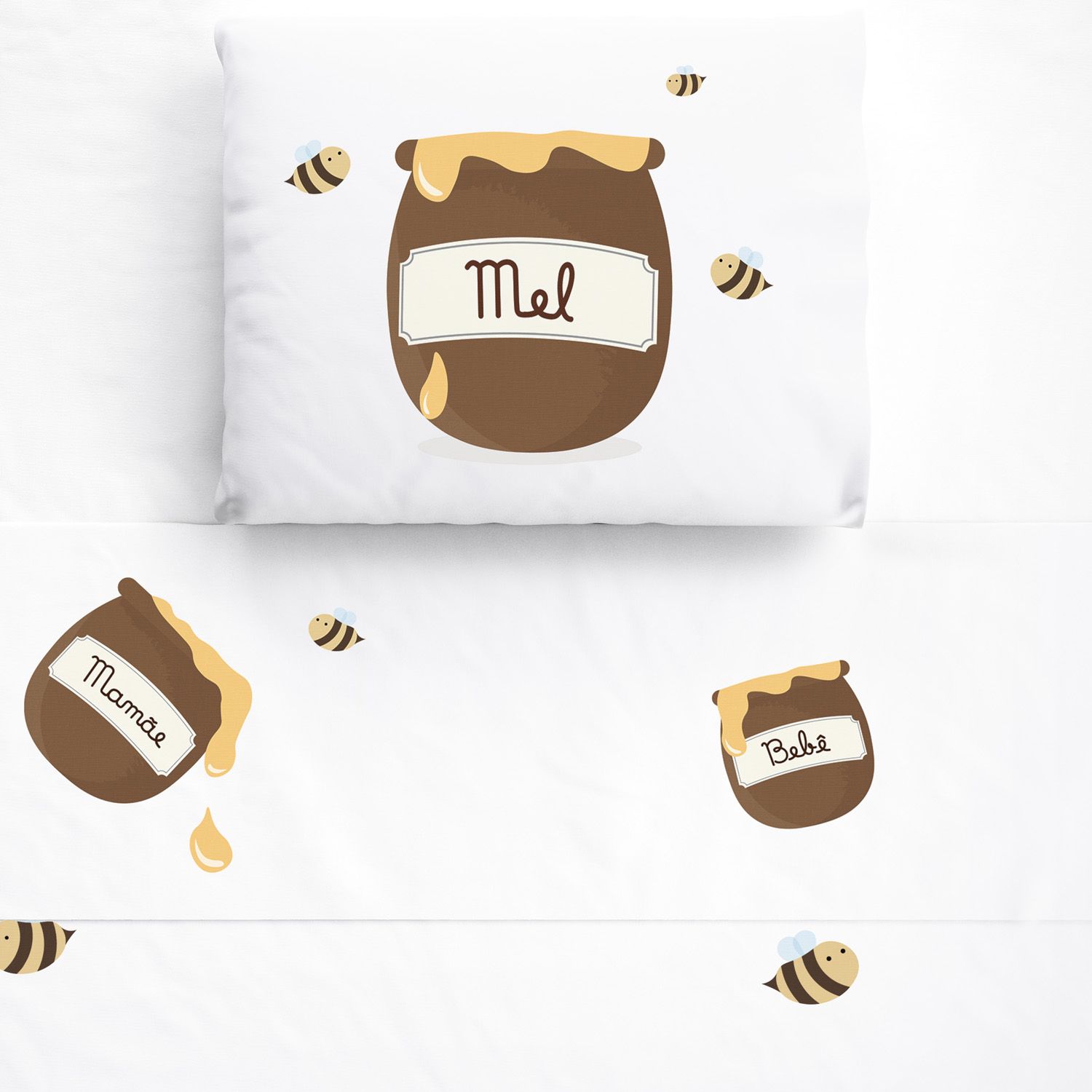 O Jogo Lençol de Berço Potes de Mel é um conjunto completo para o enxoval do bebê dos sonhos! Ele vem com três peças essenciais para o berço: lençol de baixo branco com elástico, lençol de cima com vira estampado e fronha com estampa de patinhas.