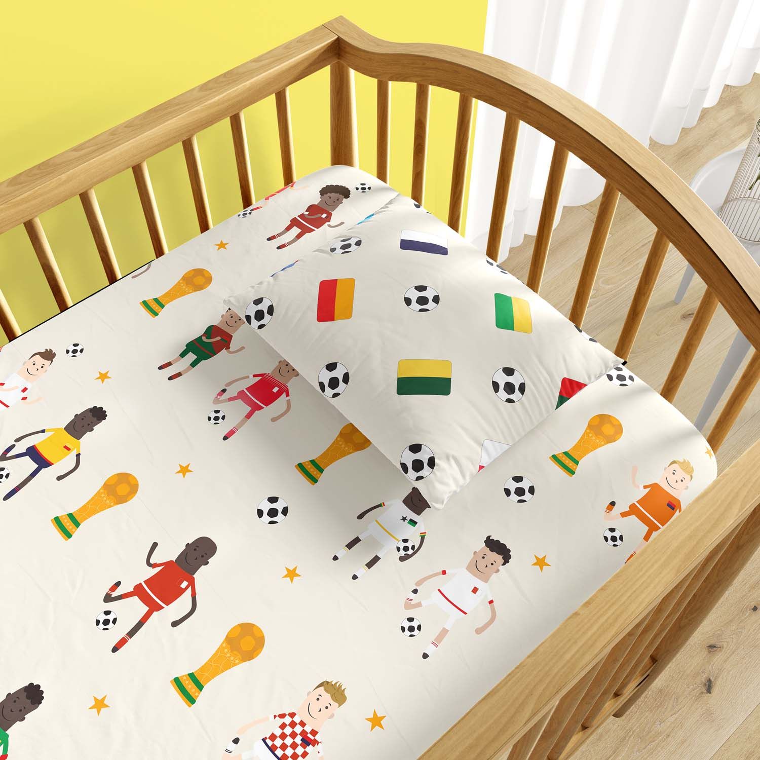 Criação exclusiva Grão de Gente, o enxoval inova com estampas que remetem às bandeiras dos países participantes da competição. Além de simbolizar as seleções, elas representam a diversidade e a união, valores pelos quais o futebol é tão conhecido e popular entre as crianças.