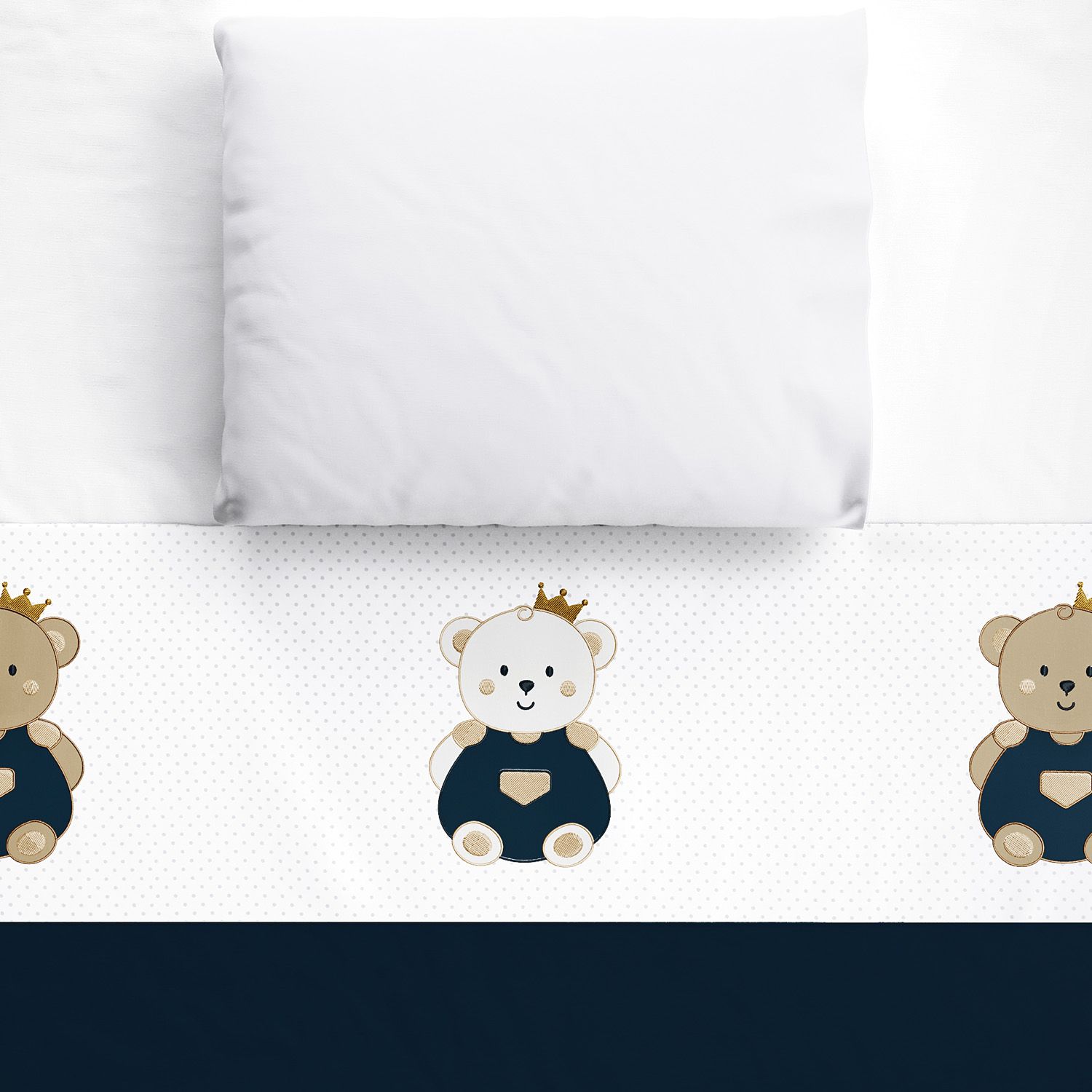 O Jogo de Lençol de Berço Ursinho Realeza é um conjunto completo para o enxoval do bebê dos sonhos! Ele vem com três peças essenciais para o berço: lençol de baixo branco com elástico, lençol de cima azul marinho com vira branca estampada e fronha branca.