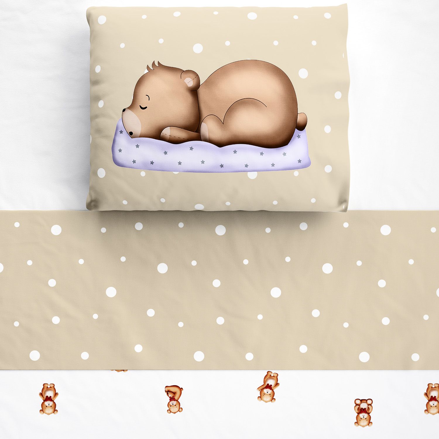 O Jogo de Lençol Berço Ursinho Vintage Poá é um conjunto completo para o enxoval do bebê dos sonhos! Ele vem com três peças essenciais para o berço: lençol de baixo branco com elástico, lençol de cima branco estampado com vira bege e poás e fronha bege estampada.